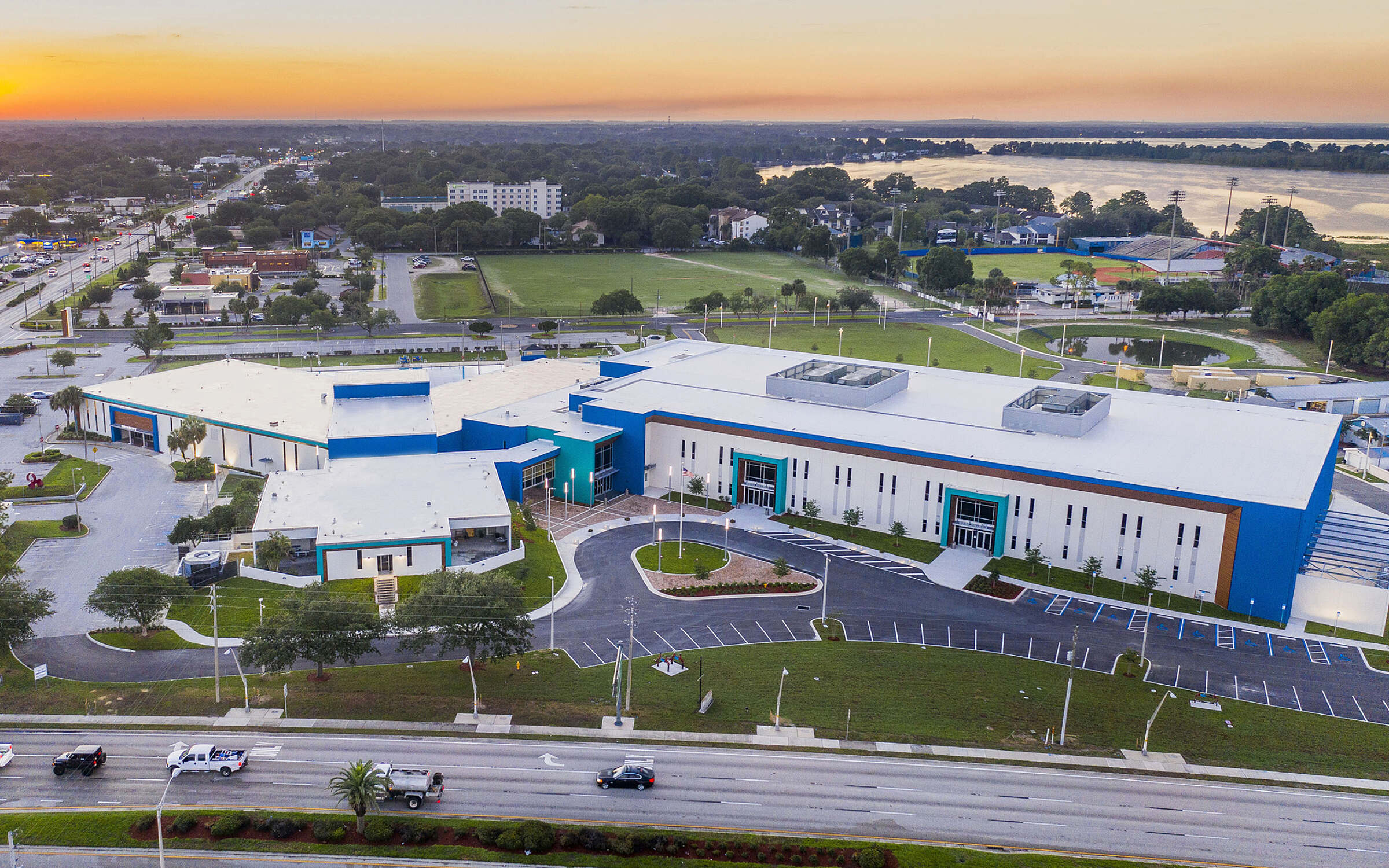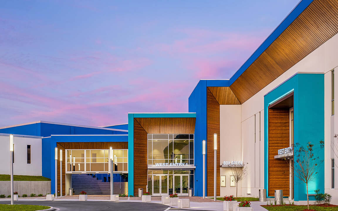The AdventHealth Fieldhouse and Conference Center stands as a premier destination for sports, events, and community gatherings in Winter Haven, Florida. Strategically located along U.S. Route 17 and Cypress Gardens Boulevard, the facility serves as a striking gateway into the city and a vibrant community anchor. With its bold architectural presence and flexible design, the Fieldhouse was envisioned to accommodate a wide range of uses—bringing together athletics, entertainment, and economic opportunity under one roof.