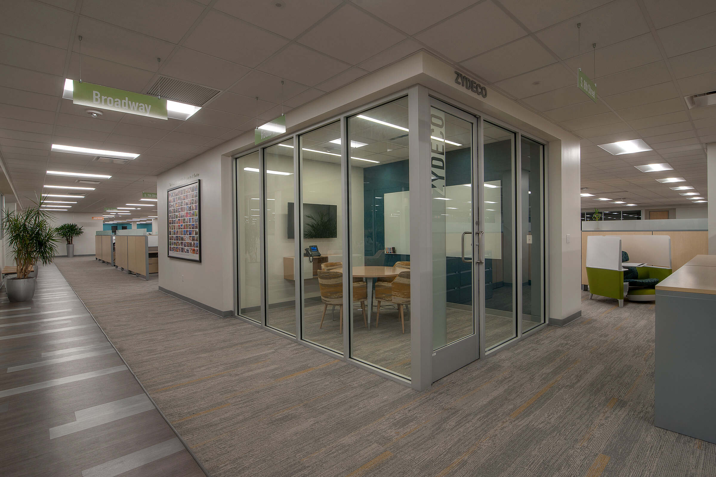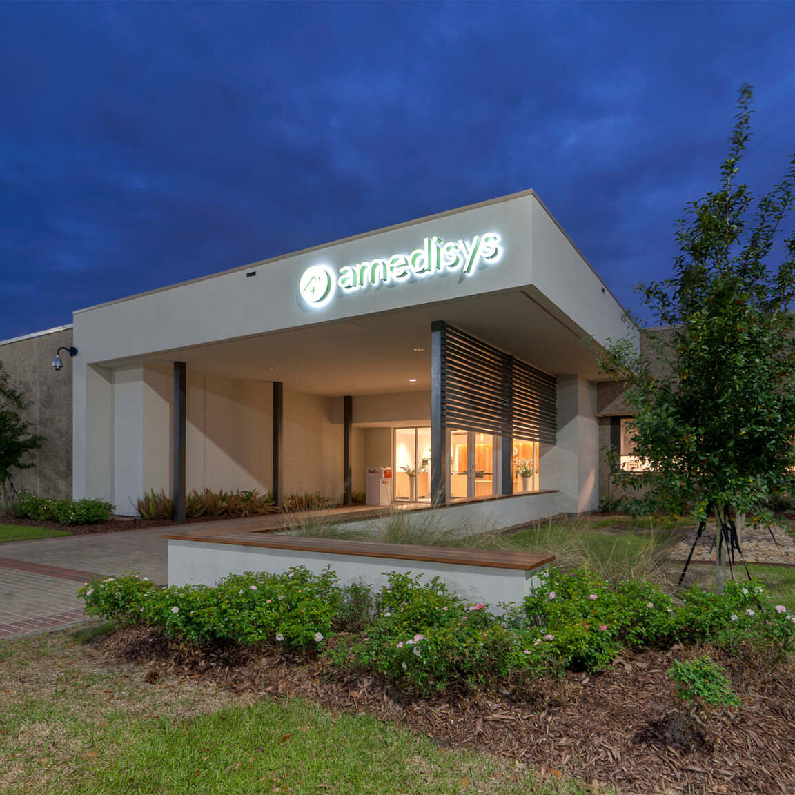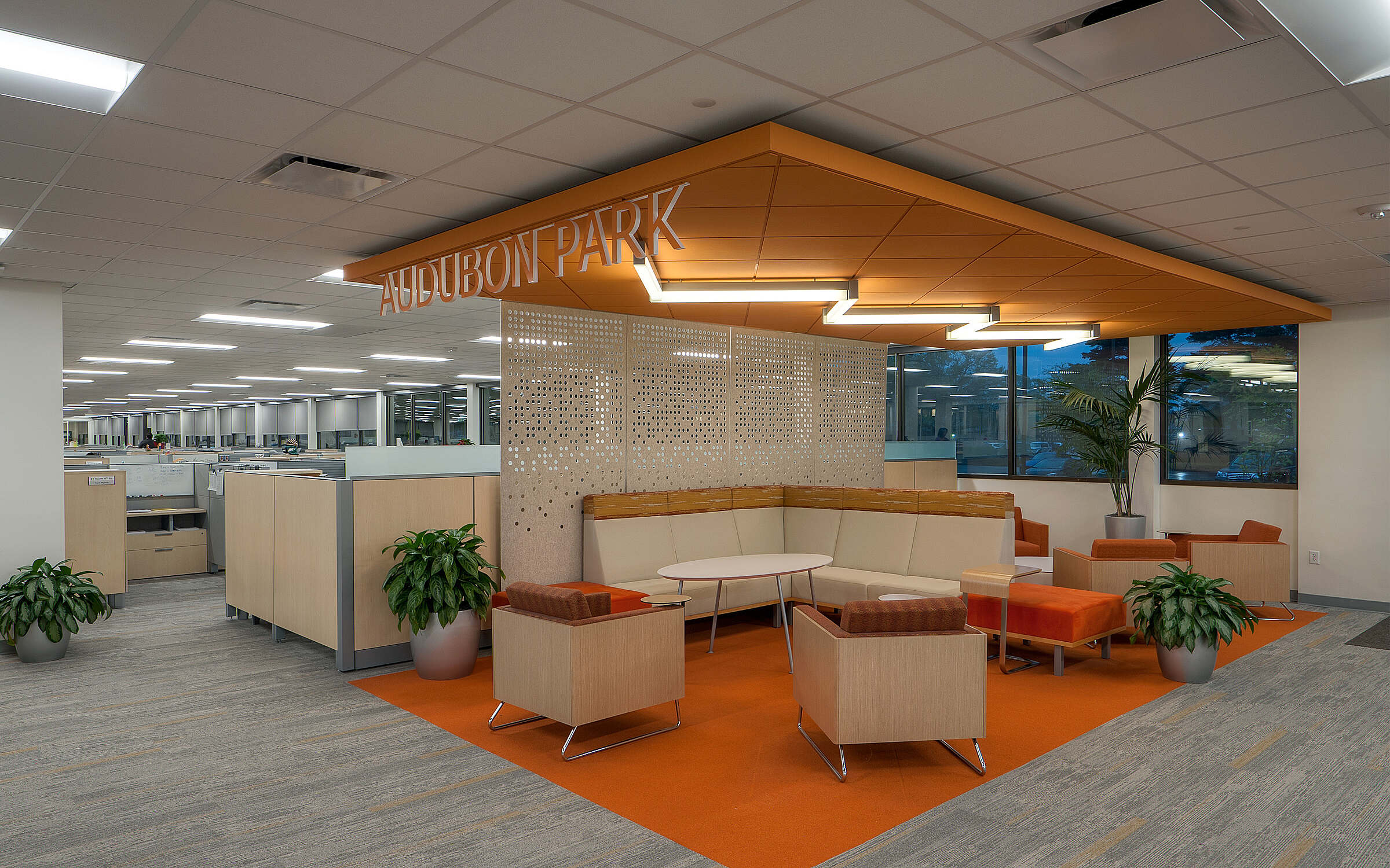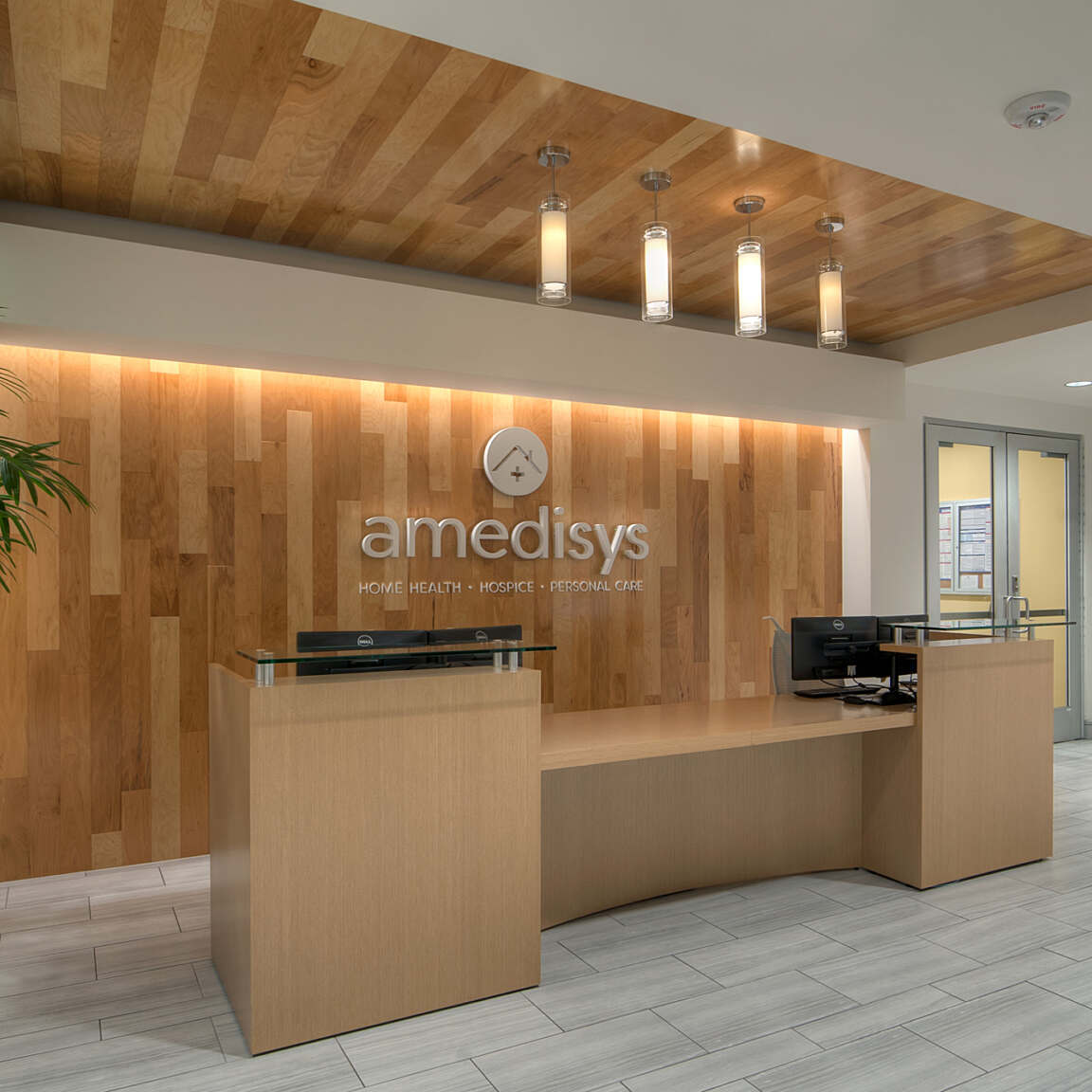 The interior renovation of Amedisys Home Health’s American Way location spanned nearly 80,000 SF. The project transformed a cavernous and uninspired commercial space into a bright, dynamic, efficient, and engaging atmosphere that fosters creativity.