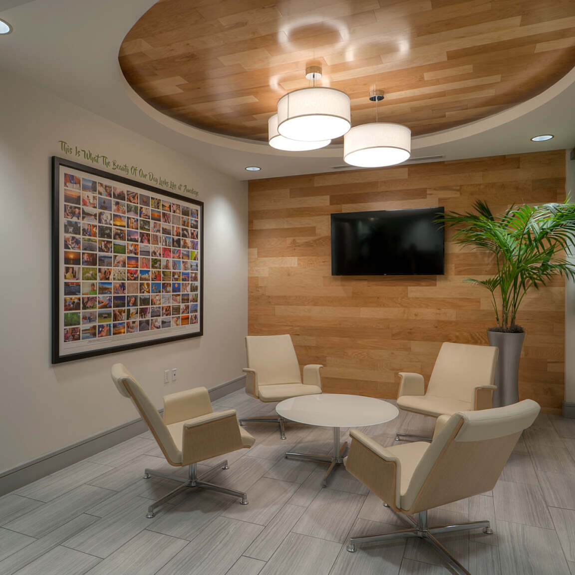 Employees easily can step away from their primary workstations and explore technology-supported one-on-one, small-group and large-group collaborative areas as well as open meeting spaces, coffee bars, lounges and break rooms. The shared spaces maintain separate identities through the intentional use of color, ceiling details, greenery, lighting and graphics — all reflecting Amedisys’ brand and corporate personality.