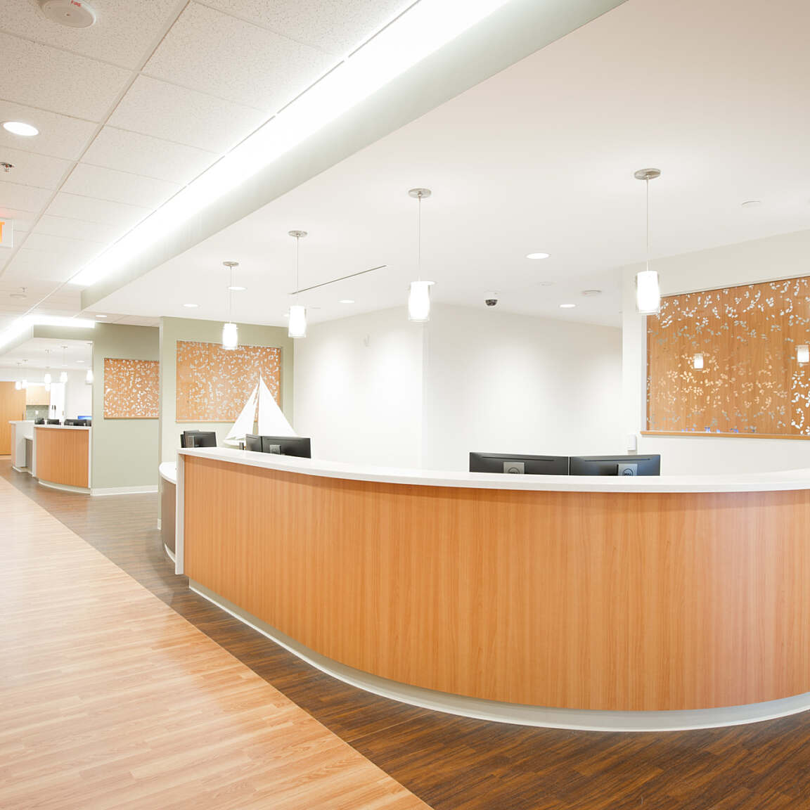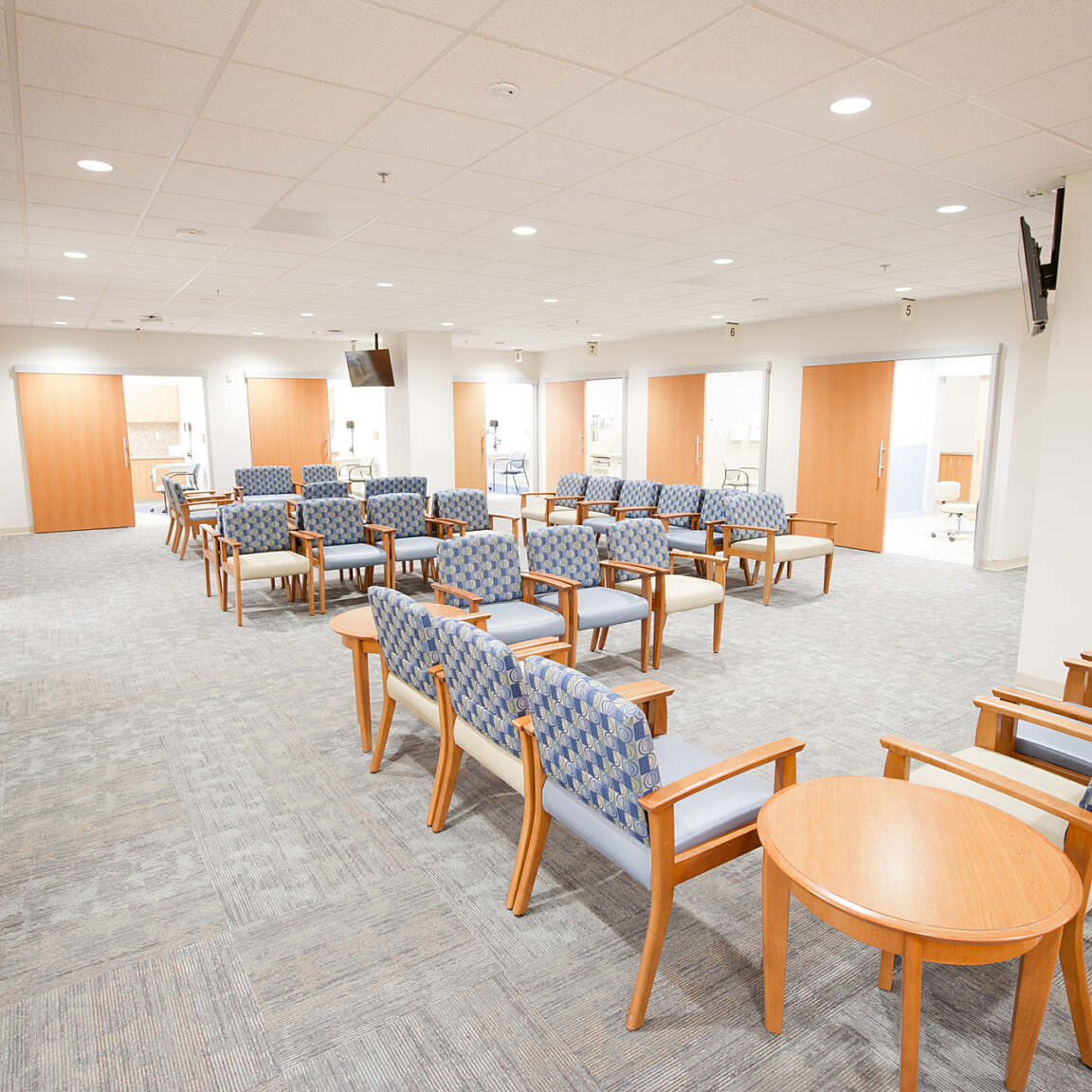 Lean design principles were applied to the process and flow. Some of the noticeable features include the separation of flow between patients and staff using an on-stage/off-stage approach. Centralized scheduling, testing and care team work areas within the suite encourage collaboration between the subspecialties. On-site testing and educational space is also an integral part of the practice, bringing the centralized services to the patient.