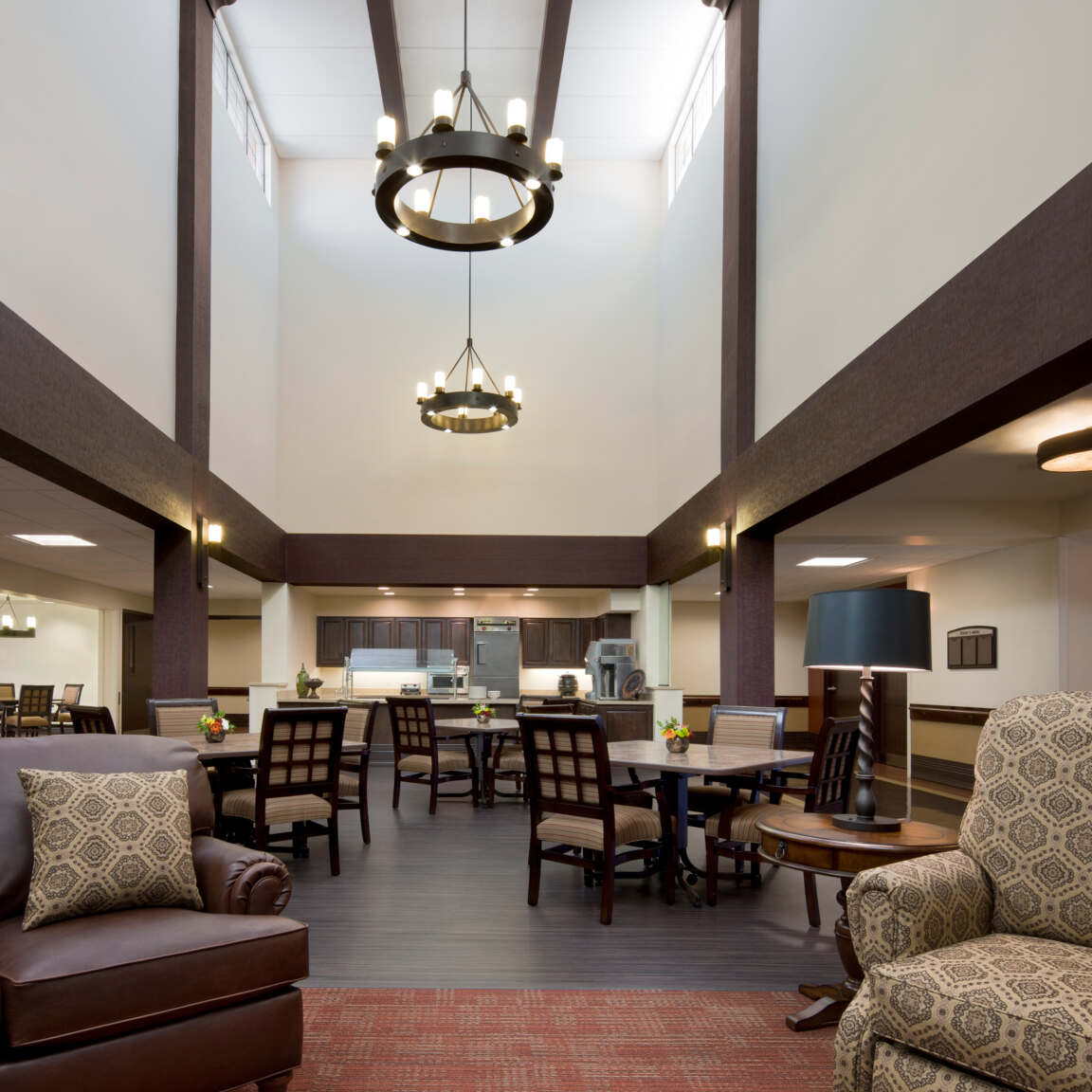 Beyond these core components, the facility’s layout also integrates a two-story commons and administration building. This building acts as a central hub of resident amenities, housing a range of services and spaces including a central kitchen, spacious great rooms, a community gathering space, an inviting internet café, a well-stocked library, a charming gift shop, a welcoming reception area, and administrative offices.