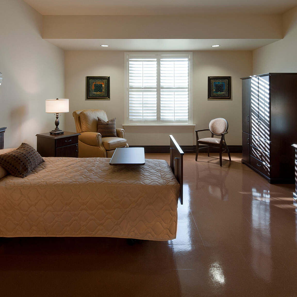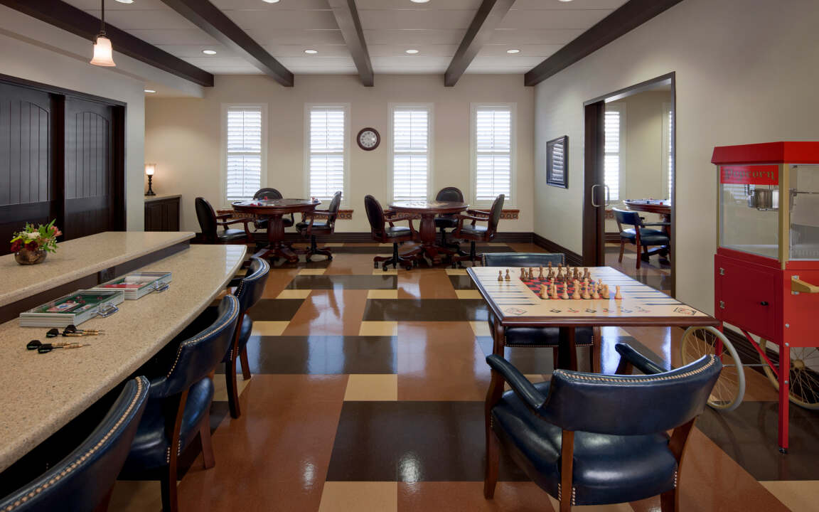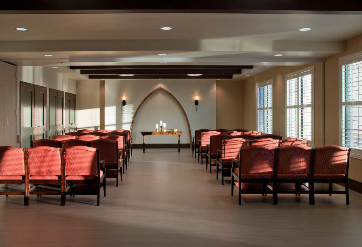 The chapel offers a peaceful, reflective space for veterans and their families, providing a place for spiritual solace and community gatherings. Designed with a serene atmosphere, it complements the facility's neighborhood-oriented design and serves as an integral part of the home's commitment to the well-being of its residents.