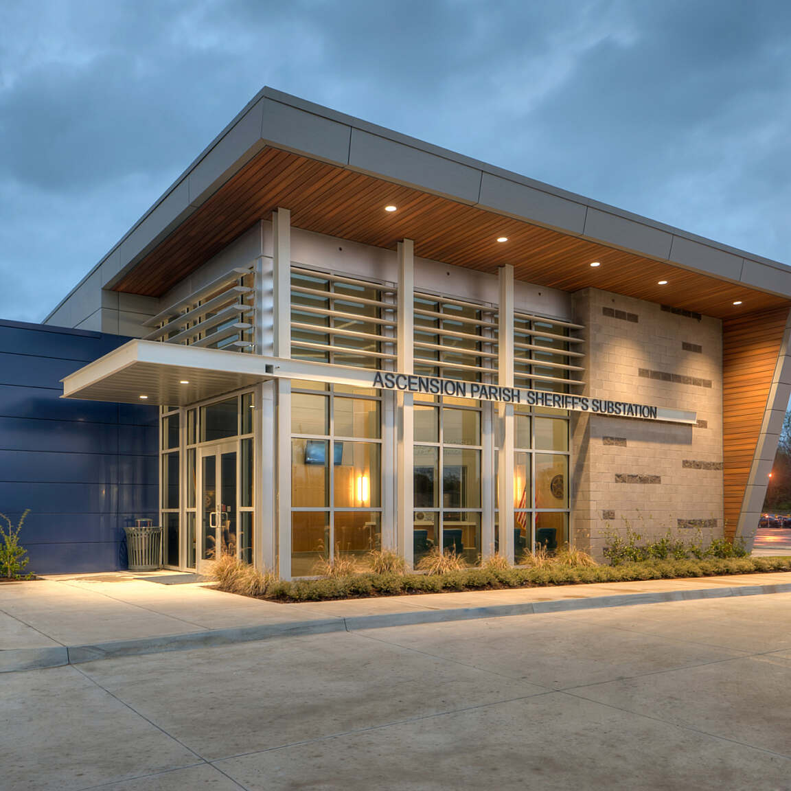 To better serve the growing Gonzales community, the Ascension Parish Sheriff’s Office worked with the design team to develop the program for a new 11,000-square-foot Sheriff’s Substation. The structure features a public lobby with ancillary consultation room to accommodate visitors, law enforcement offices with a squad briefing room, and an adjacent computer lab for uniformed officers. Other areas include a break room, a booking facility with evidence processing and storage space, departmental offices for the narcotics and Go-team divisions, civil case processing and administrative support offices, and a business office for reconciling tickets and fines.