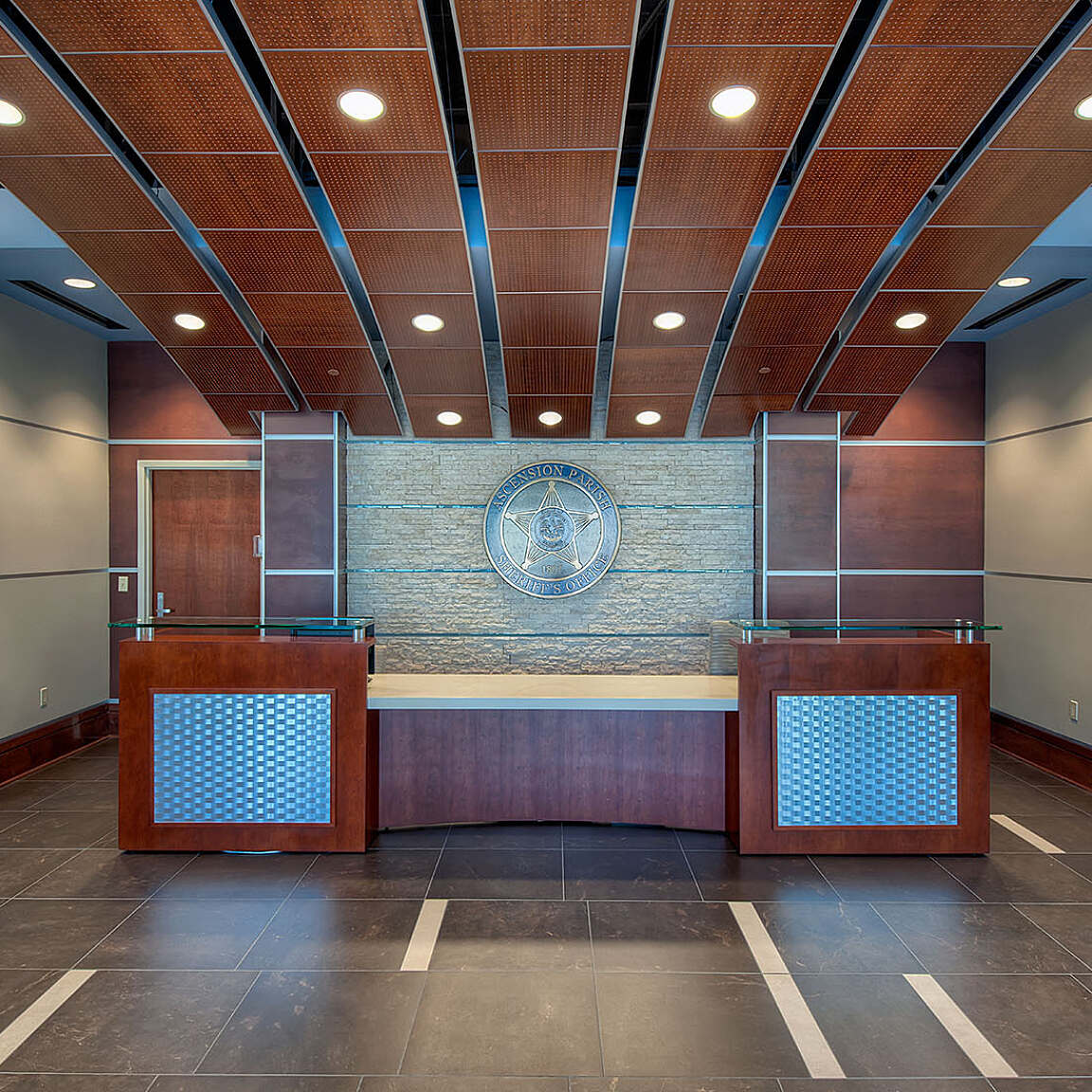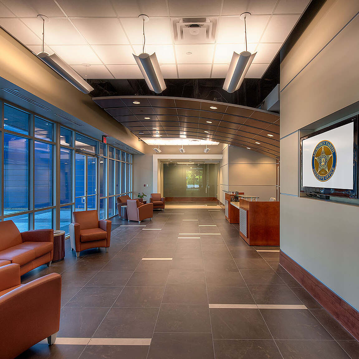 Taking advantage of generous ceiling heights, achieved through careful coordination with engineers, the playfully curved ceiling planes support the Department’s technology-driven and modern style.