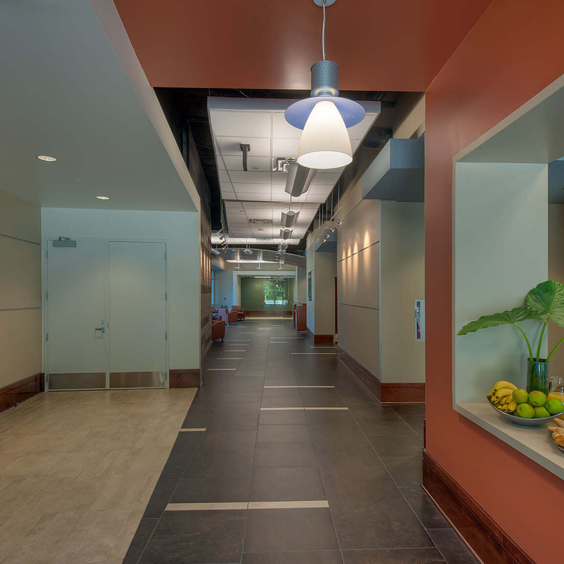 Separating the staff area by a glass wall, this central corridor contains lowered ceiling planes to transition you from open to more private areas.
