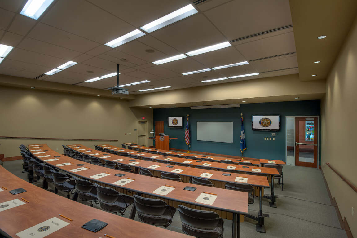 Integrated with technology and multiple lighting schemes, the Training Room provides an intimate educational setting for on-going law enforcement training or a briefing room during times of emergency.