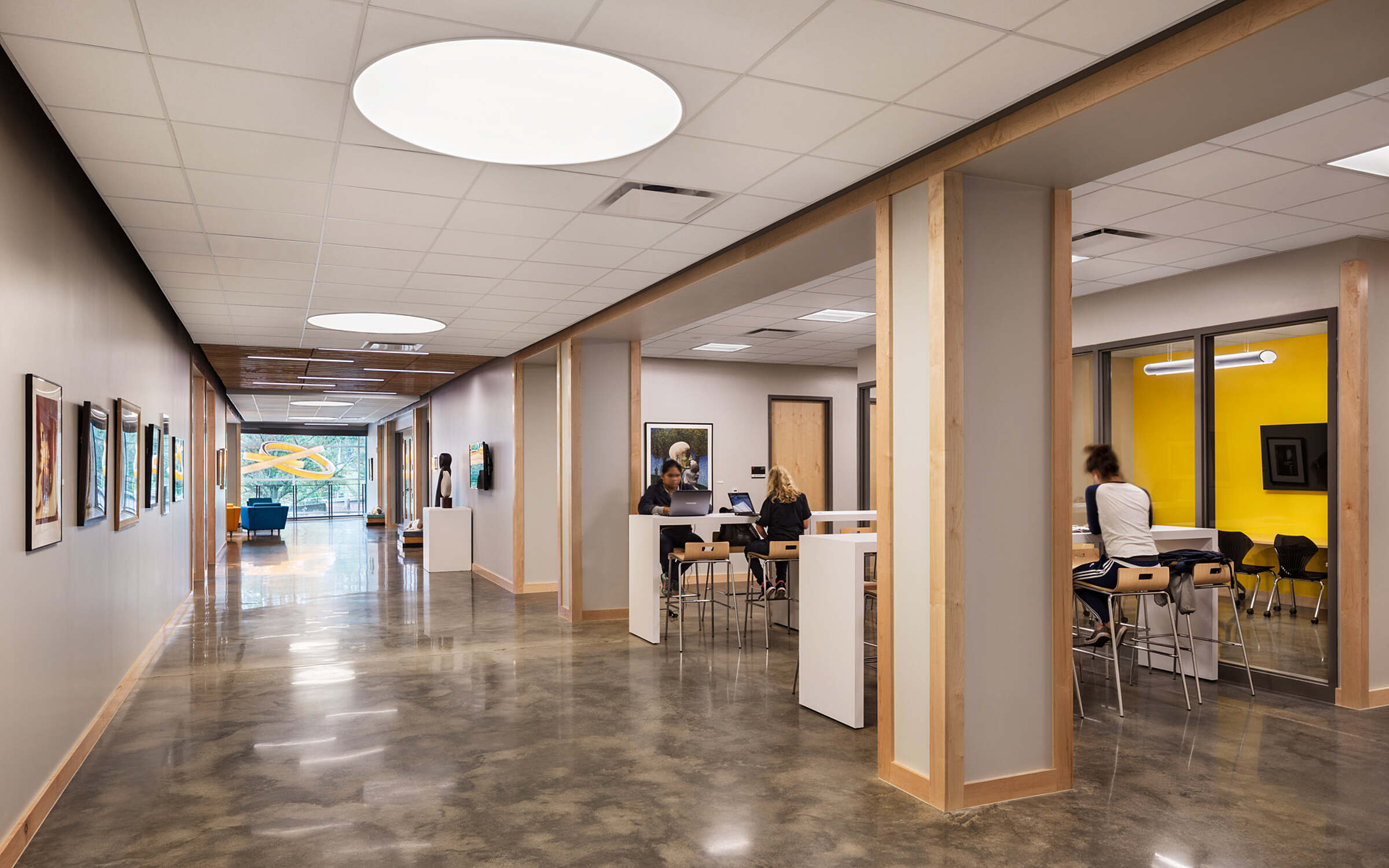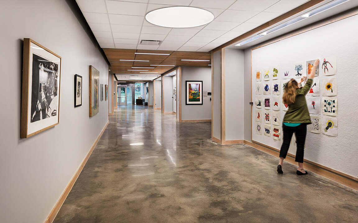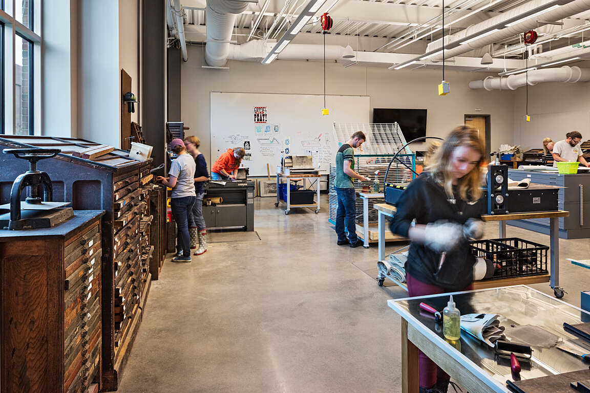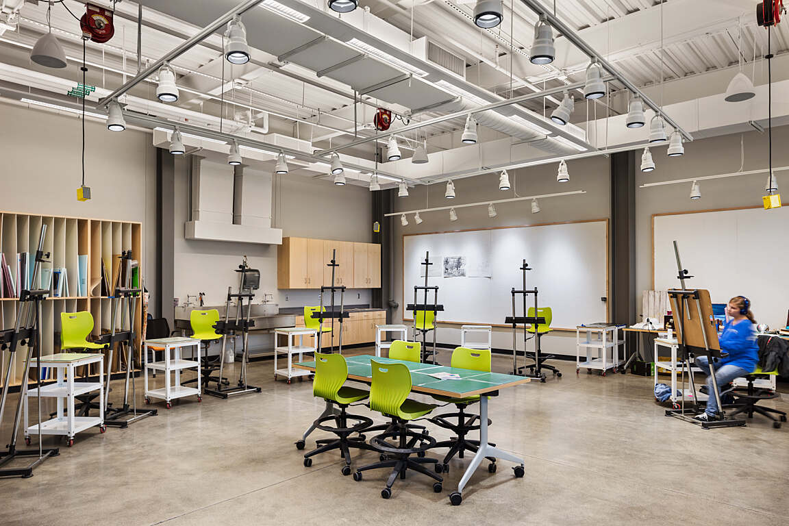 The building houses two typical classrooms as well as studio art classrooms equipped for printmaking/silk-screening, 2D Illustration, drawing, photography (currently both digital and traditional), digital arts, and collections (teaching students how to create collections). Faculty office spaces include 21 individual offices, meeting spaces, and several informal student gathering areas. The two-story, steel frame building features a masonry exterior with ribbon windows and an industrial-style interior with polished concrete floors, exposed ceiling and wood ceilings with track lighting.