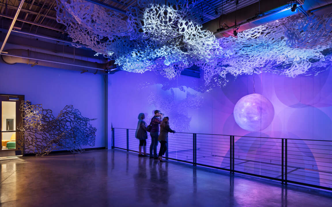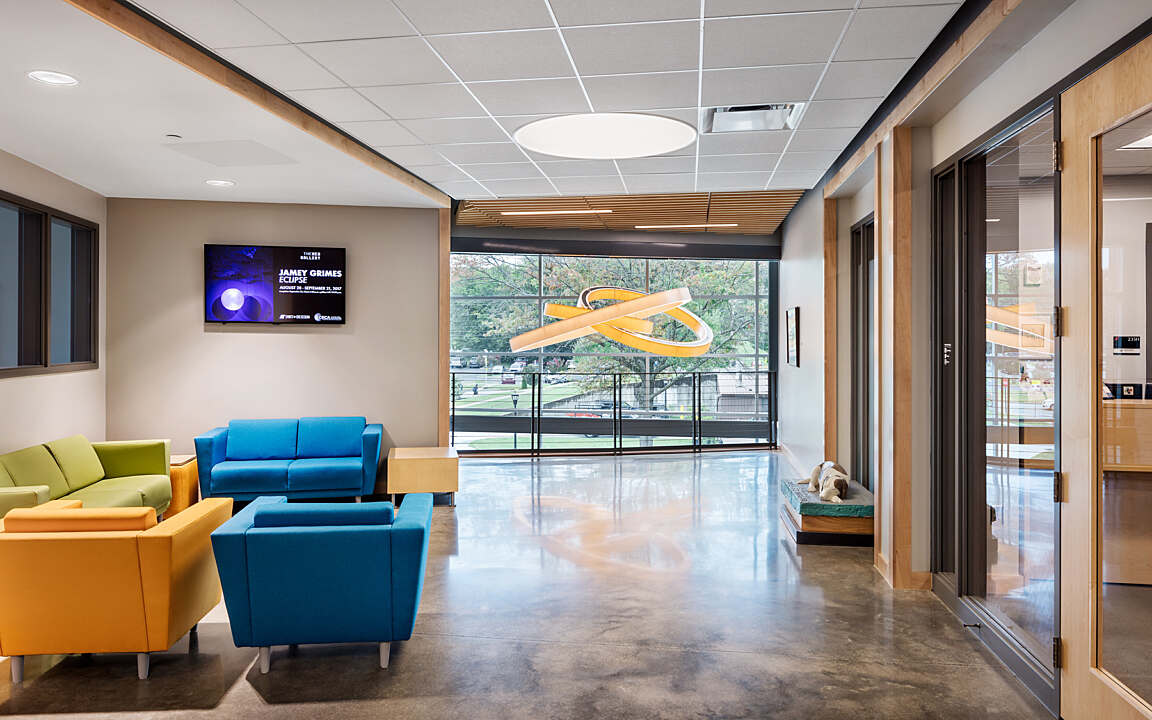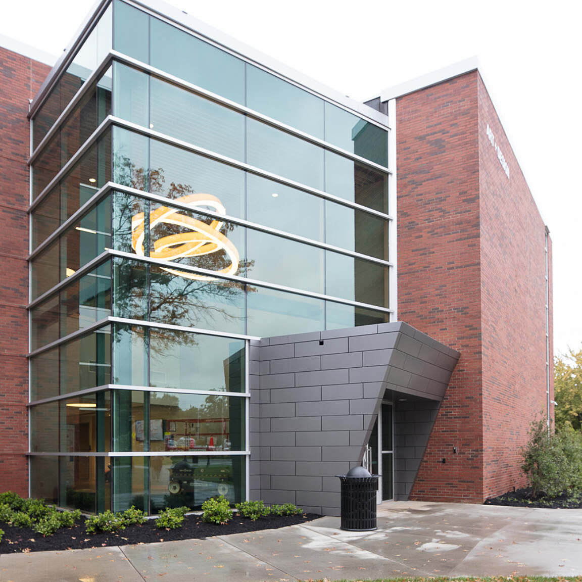The building houses two typical classrooms as well as studio art classrooms equipped for printmaking/silk-screening, 2D Illustration, drawing, photography (currently both digital and traditional), digital arts, and collections (teaching students how to create collections). Faculty office spaces include 21 individual offices, meeting spaces, and several informal student gathering areas. The two-story, steel frame building features a masonry exterior with ribbon windows and an industrial-style interior with polished concrete floors, exposed ceiling and wood ceilings with track lighting.