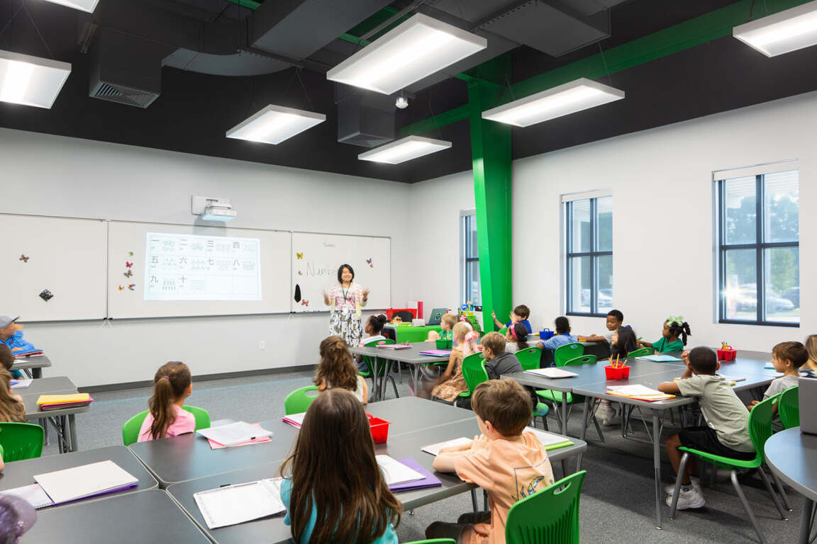 The building supports a rigorous STEM (Science, Technology, Engineering and Math) program as well as more traditional teaching methodologies via smaller-scale classrooms. It also includes multipurpose spaces designed to receive an abundance of natural light and a black box theater that opens up to a full-size gymnasium. A large outdoor covered play area ensures students can enjoy activity and socialization year-round regardless of weather conditions.