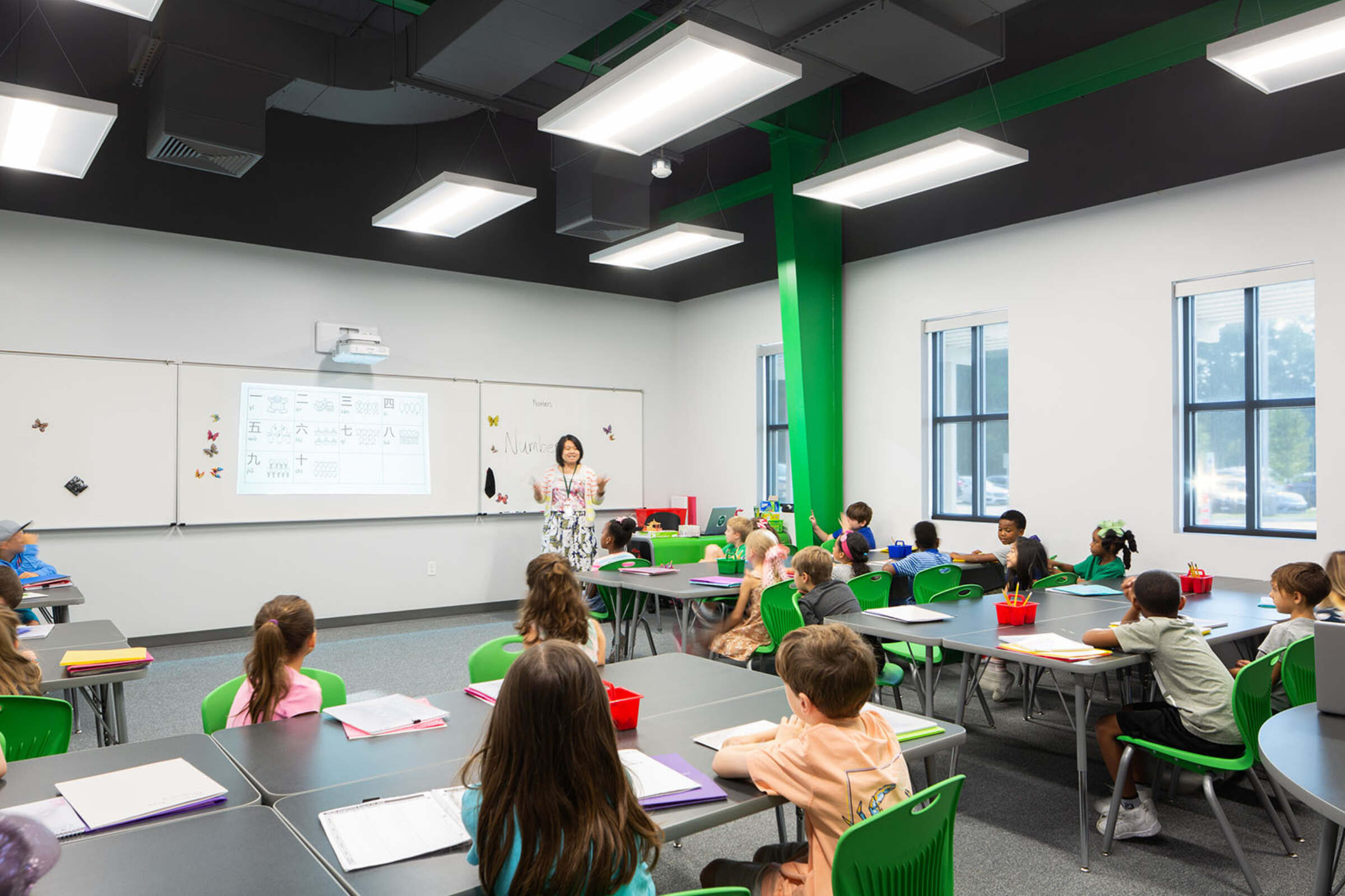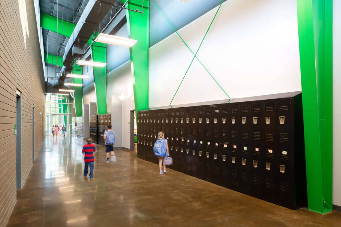 Instead of traditional vinyl composition tile floors and acoustical ceiling tiles, the school offers students a lesson in architecture and construction. Mechanical systems, cabling and duct work were strategically left exposed, and polished concrete floors make the spaces feel larger and more open.