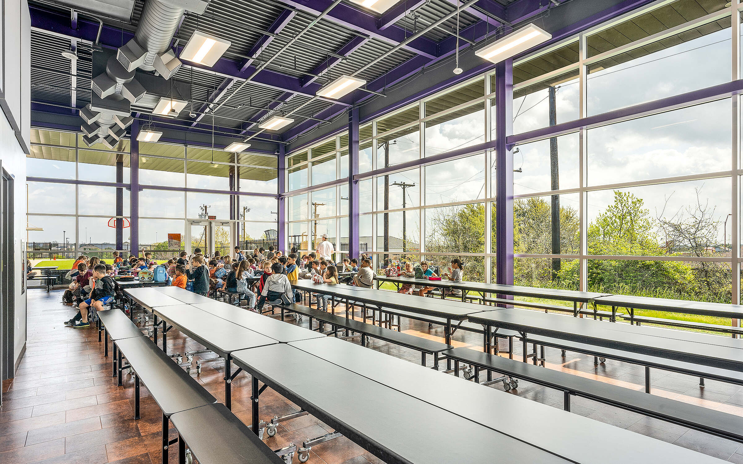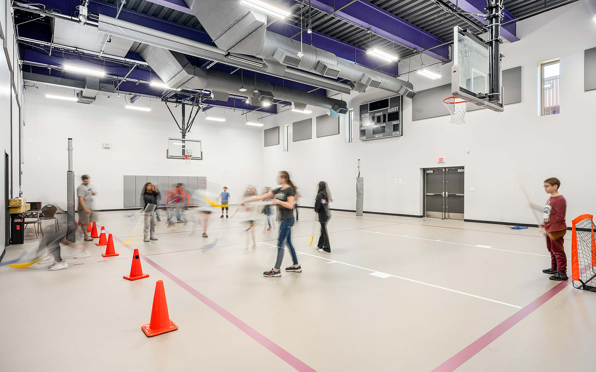 Instead of a traditional gymnasium, exercise rooms and indoor playrooms are both adaptable where they can adapt into active learning. With natural lighting throughout the space, the multipurpose room acts as their cafeteria, providing a large open space directly adjacent to their play yards.