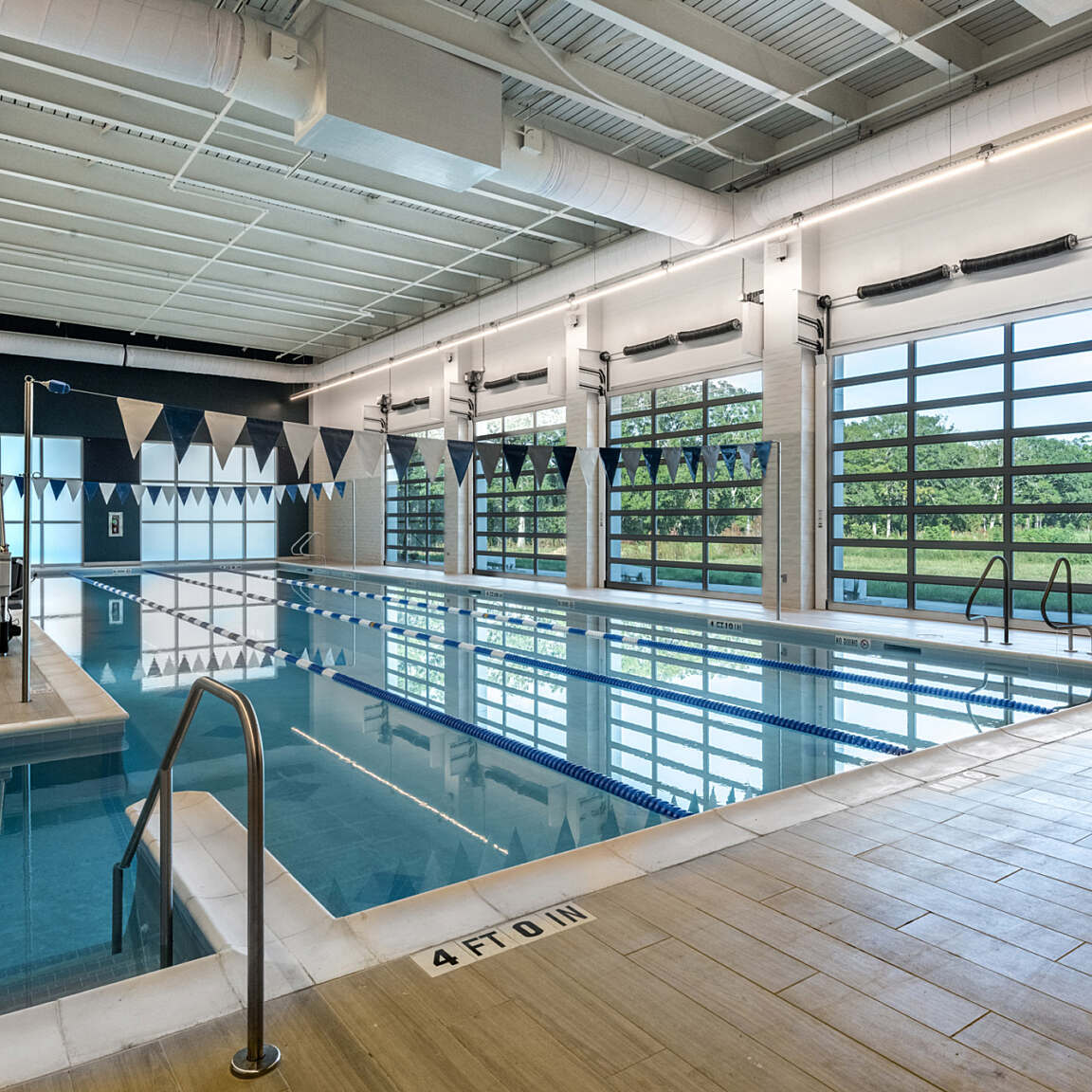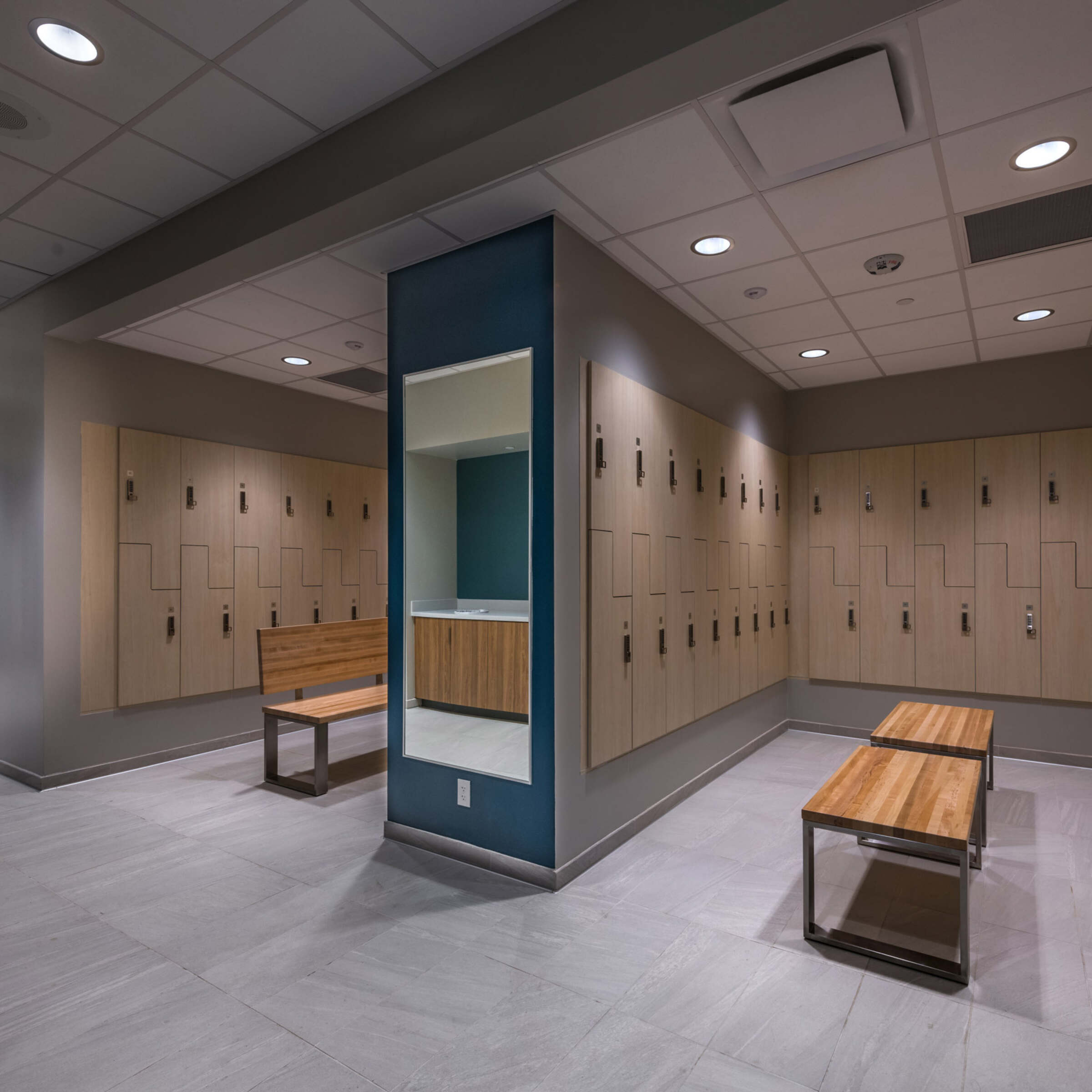 As the lifecycle cost of the building was very important to the client, all interior finishes are durable yet easy to clean, helping mitigate infection risks and avoid frequent damage and repairs. The aquatic center, in particular, includes equipment, hardware, flooring, and wall finishes designed for corrosive environments. Less future maintenance will ultimately translate into less waste and a lower carbon footprint.