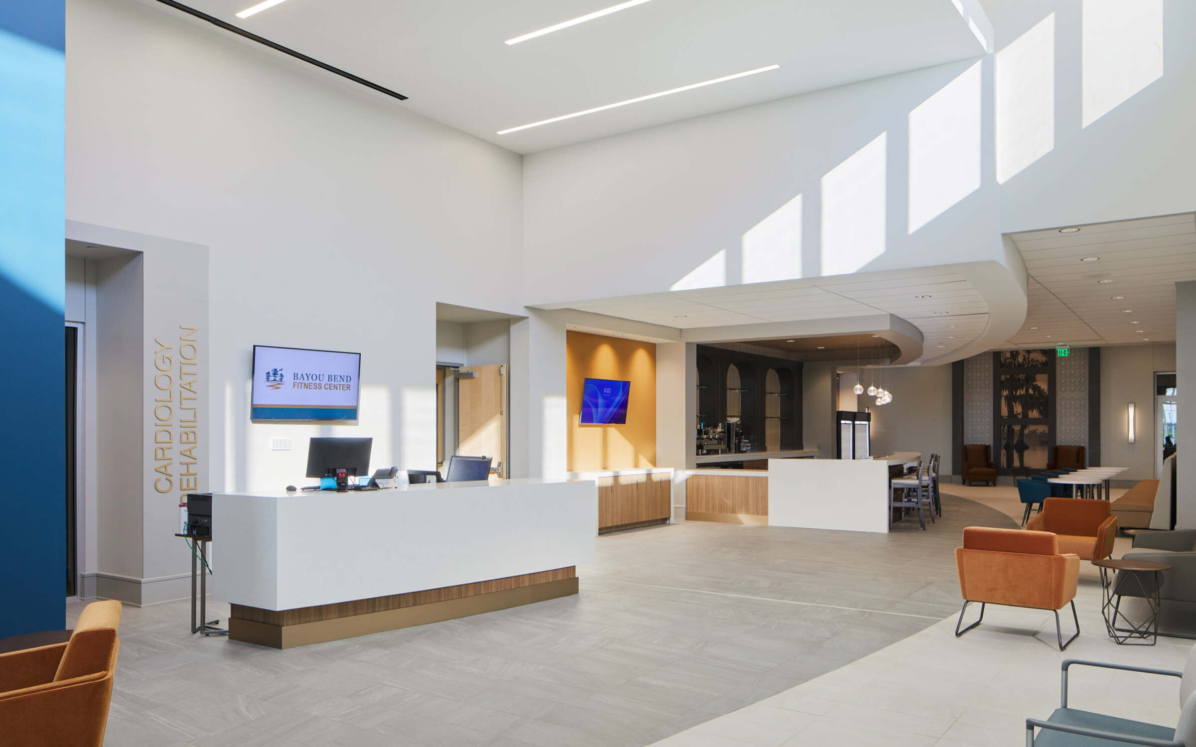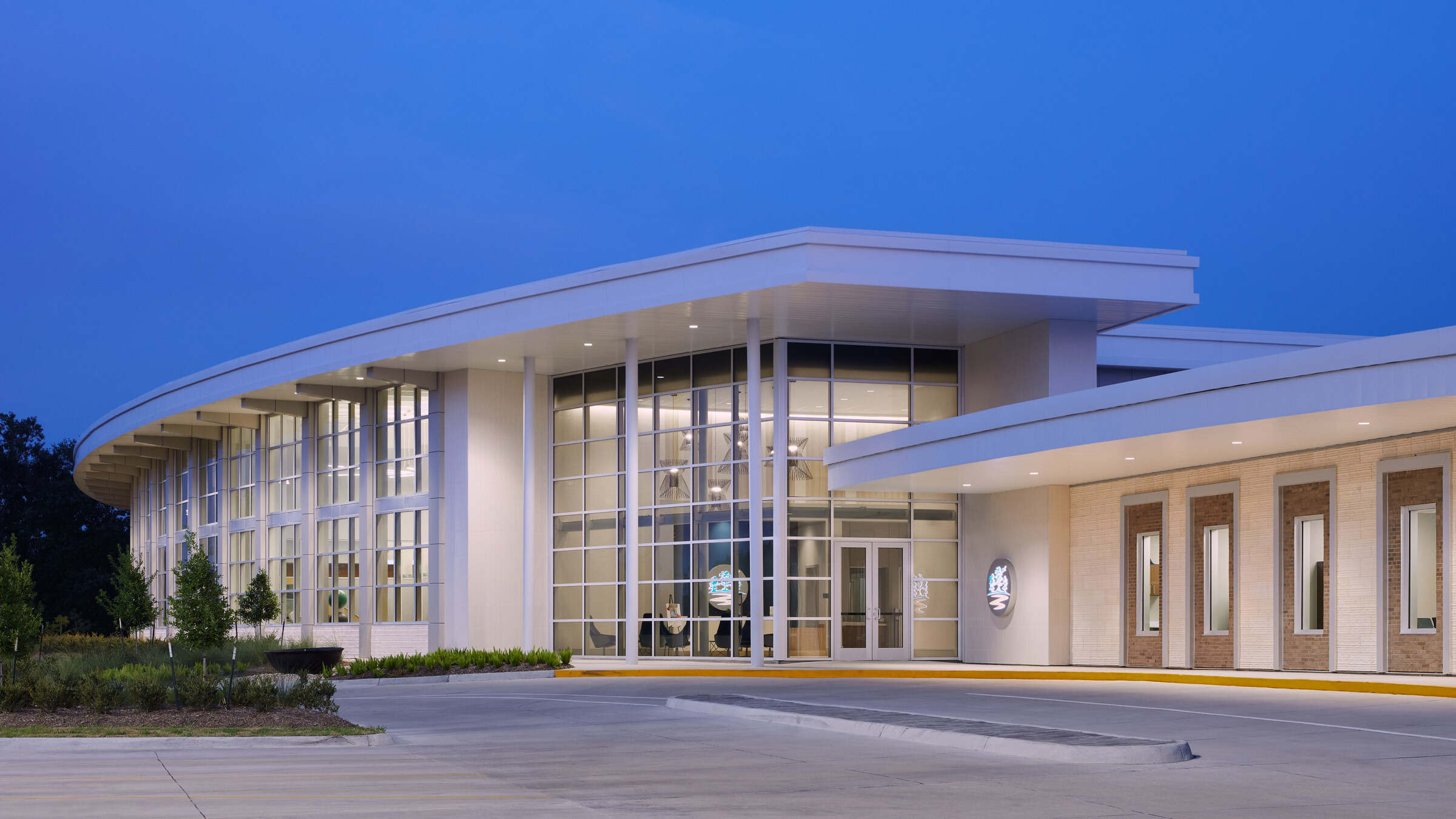 The broad window wall makes a bold architectural statement and allows natural light to filter deep into the single-story building. This iconic feature also accomplishes the client’s goal of developing a local landmark that attracts both patients and gym/aquatic center members, while also serving as a pride point for the community for decades to come.