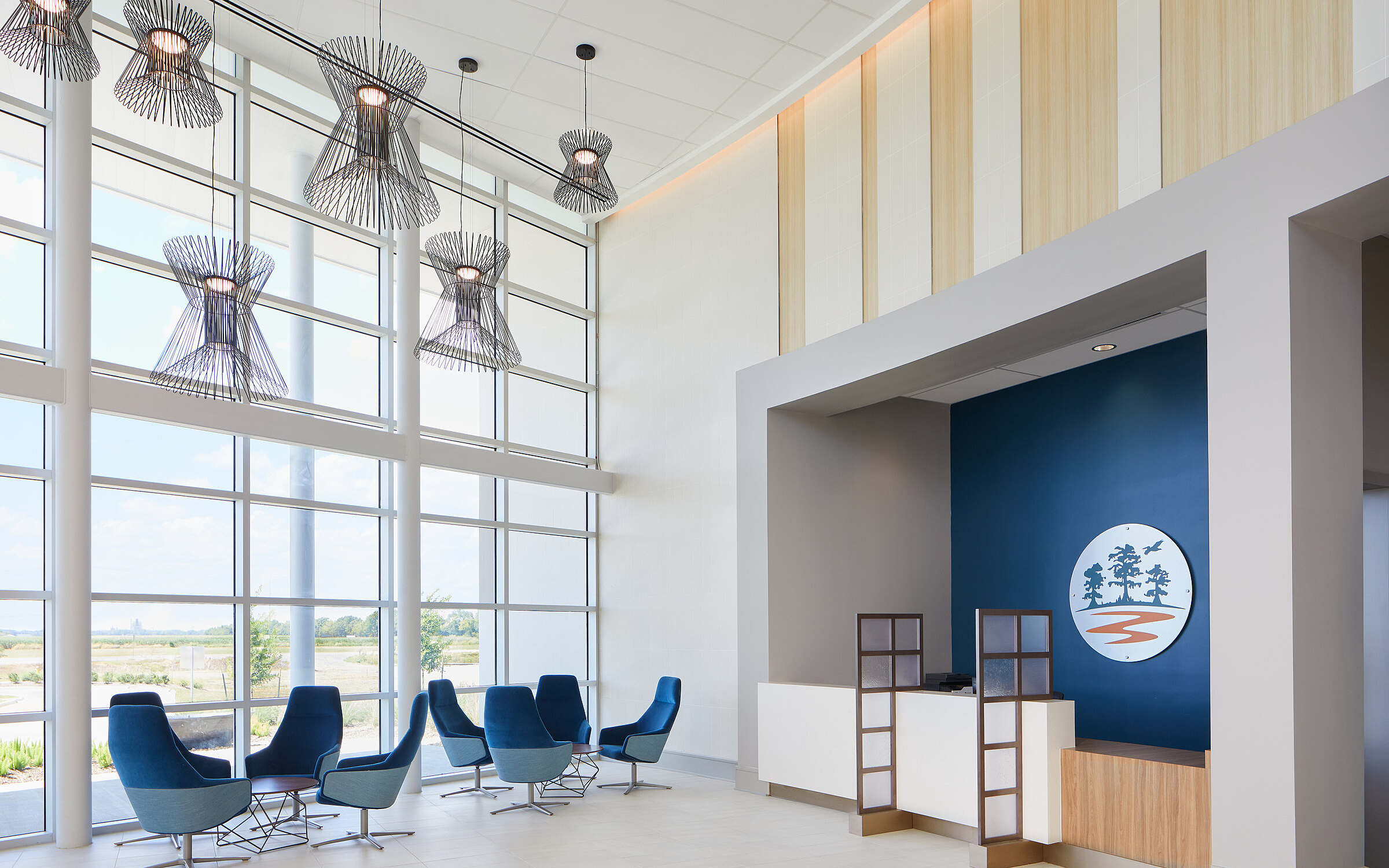The design team was careful to honor the client’s budget, vision, and preferences while delivering a beautiful, functional facility that is unique to and reflective of the community it serves. Rather than feeling institutional, both the hospitality-inspired interior and exterior are designed to welcome and relax users, reducing patient anxiety and providing a pleasant and energizing workspace for staff.