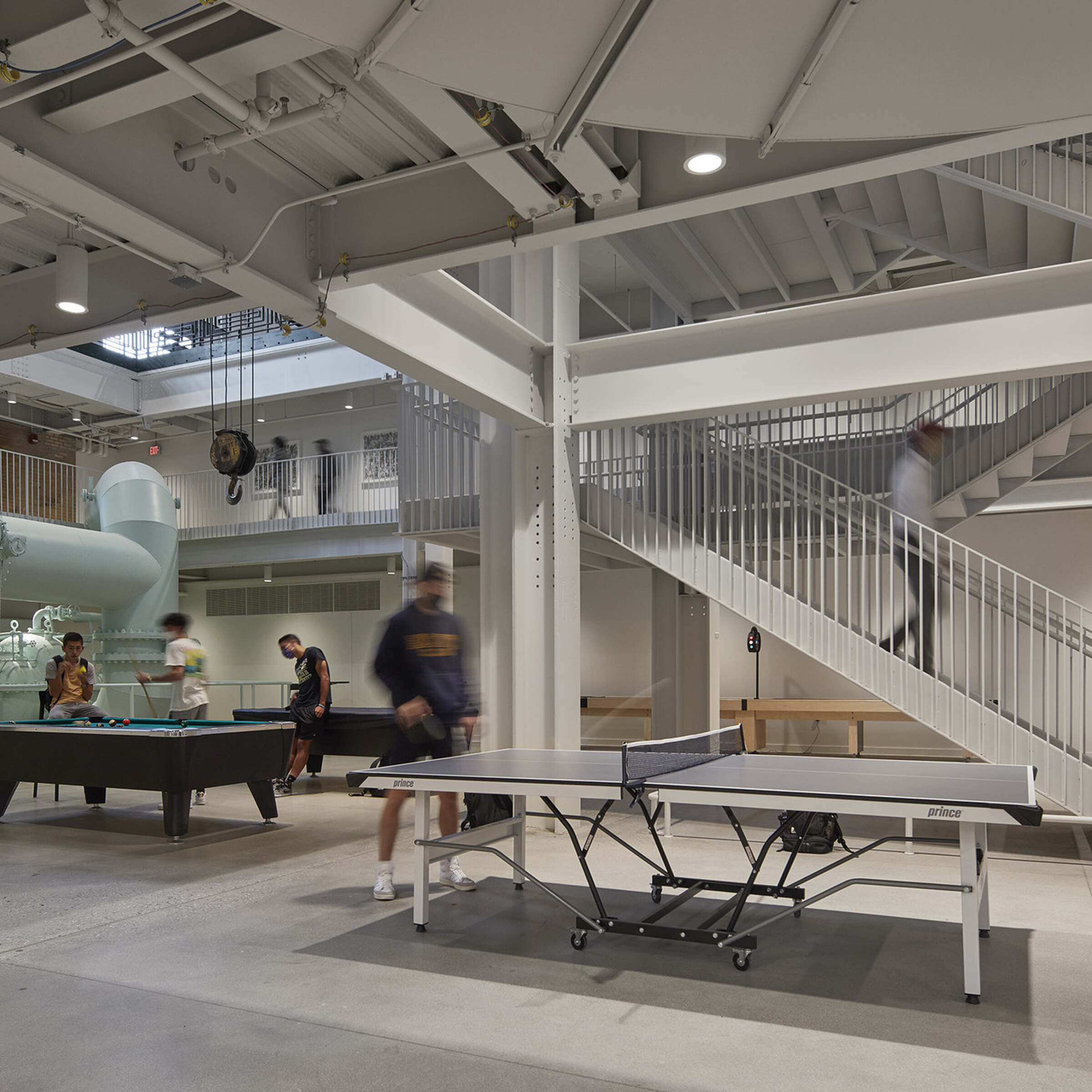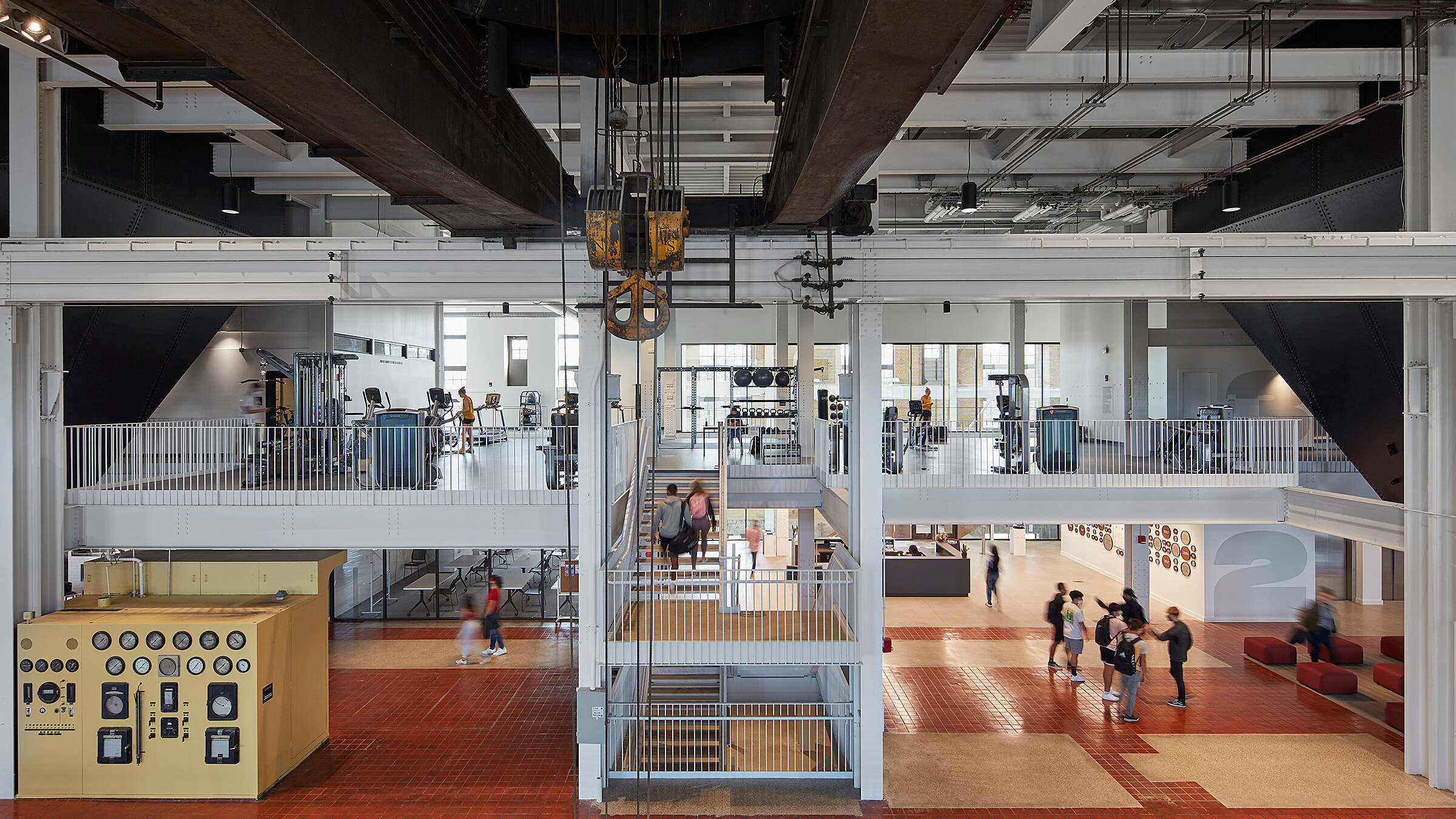 Inside, the Powerhouse houses a suspended indoor track, eight-lane competition pool, large field house, and full-service fitness center. These athletic amenities are paired with cafés, lounges, study areas, and meeting rooms to encourage both recreation and academic engagement. The building’s new program components are carefully integrated into the existing structure, maximizing functionality while maintaining the integrity of the original industrial architecture.