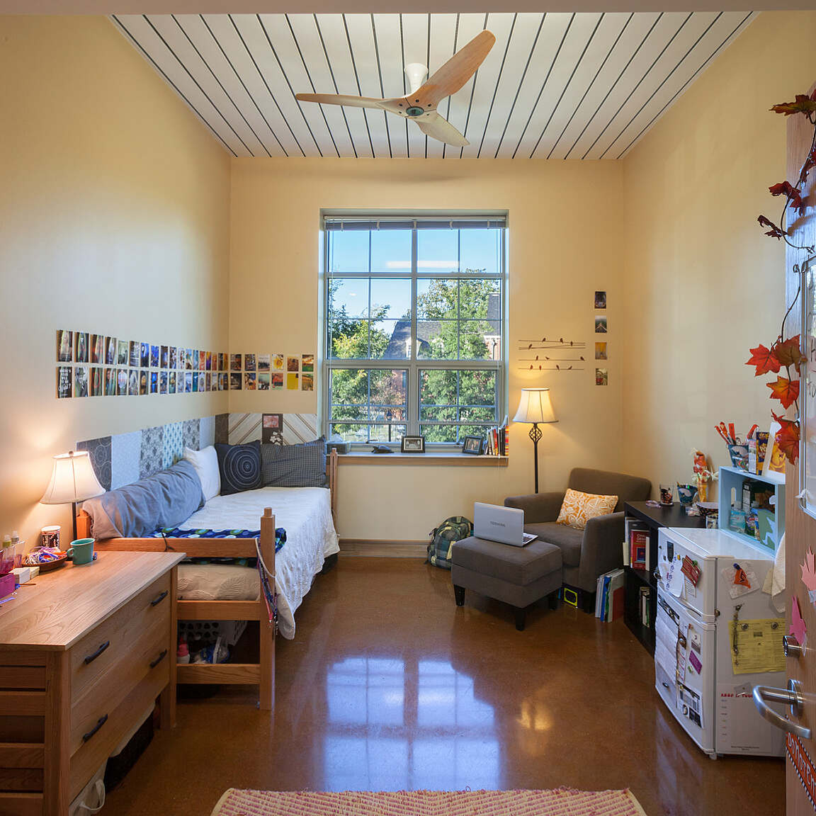 More than just a residential space, Shinn Hall serves as a living/learning laboratory where students can engage directly with sustainable practices. The project integrated the college community throughout its development, with poplar trees harvested from Berea’s FSC Certified Forest and hauled by mules to the wood studio. Students milled the wood for trim and handcrafted furniture for each room, while student-designed art—such as a ceramic Berea Sundial—enriches the building’s character.