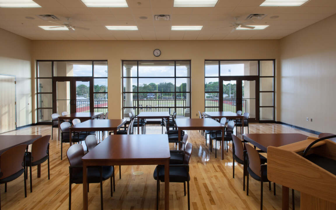 A dramatic new atrium lobby opens to the concourse with public restrooms and concession. Locker rooms, training room and team meeting rooms frame the three-court gymnasium. Athletic performance is supported by 900 spectator seats, video platform and observation balcony. Upper-level facilities include athletic offices, fitness, multipurpose room with kitchen, dance room, classroom and an alumni room that overlooks the performance court.