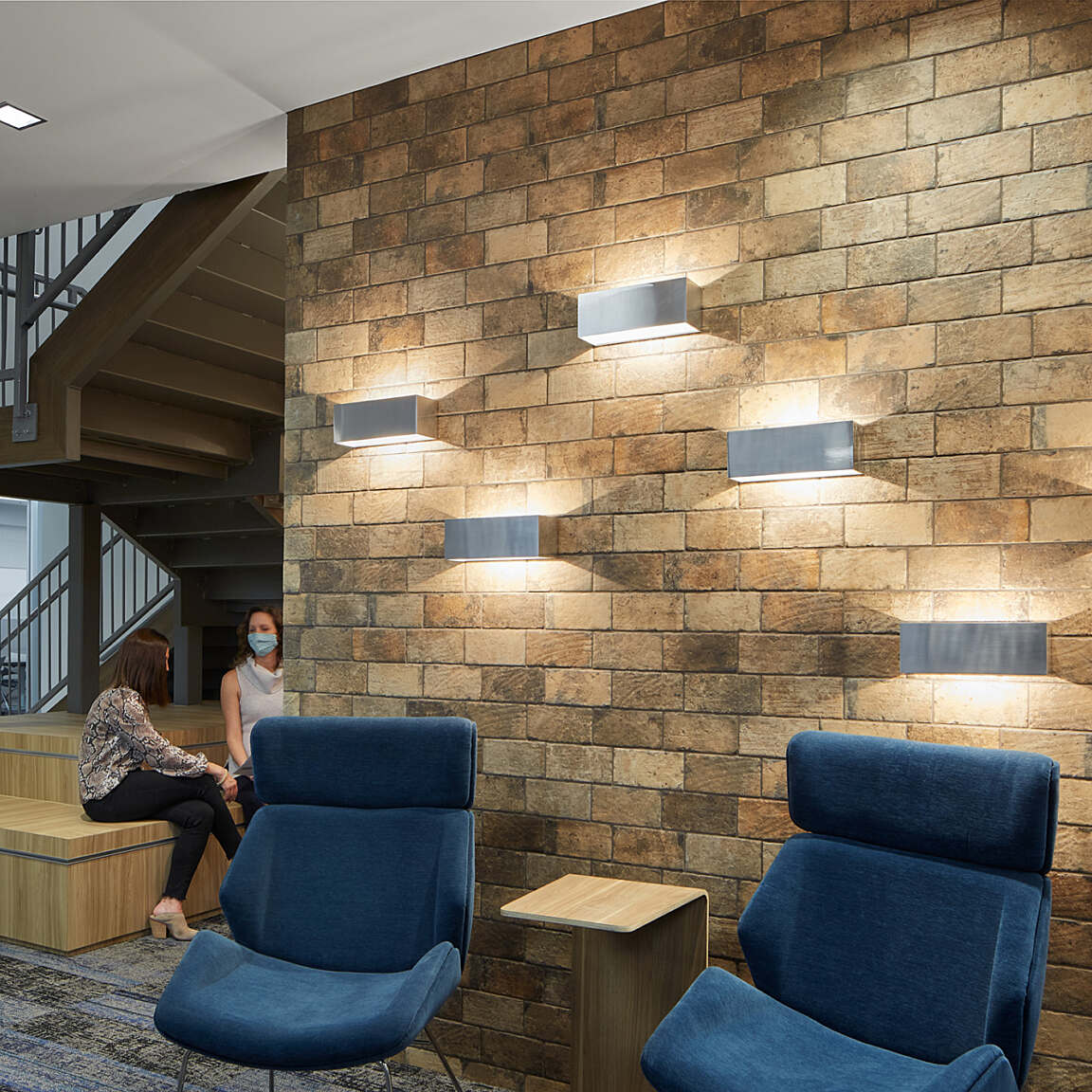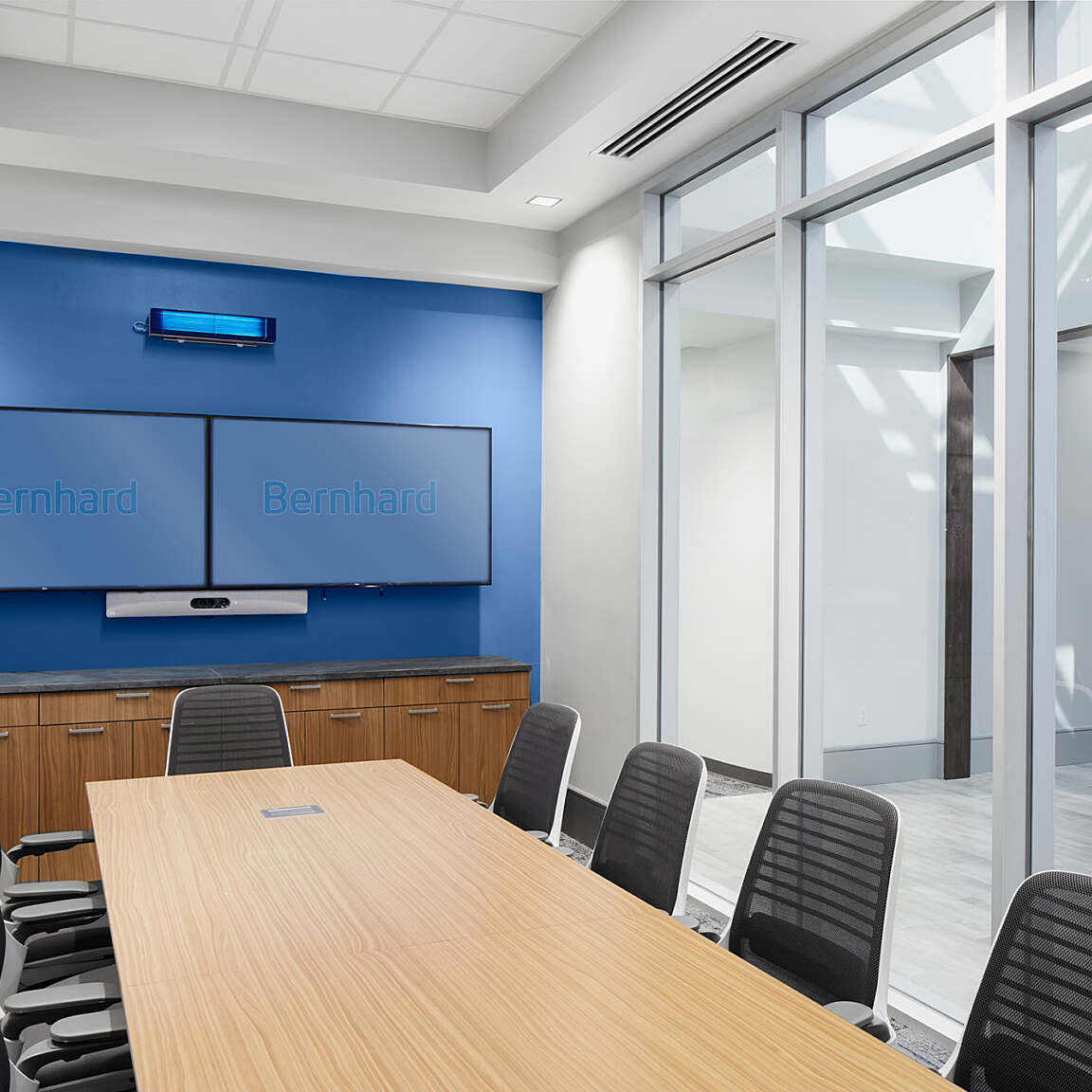 The finished project exceeds the client’s vision for their new headquarters. The lobby makes a bold first impression by showcasing Bernhard’s branding, growth and successes via a historical photo and graphic timeline. Meanwhile, staff focused spaces create the central hub for teaming and collaborative sessions while providing opportunities for individual and small group meetings. Dynamic open workspaces allow employees the freedom to move and share ideas. The technology-forward conference rooms now set the standard for all Bernhard locations with top-of-the-line video conferencing capabilities and UV light sterilization devices to create a safer environment for employees. A new mezzanine maximizing unused vertical space allowed for separation of departments that require a quiet environment. Designed with large steel beams, the mezzanine required careful coordination with the state fire marshal and permitting office as well as strategic communication with the other building tenants.