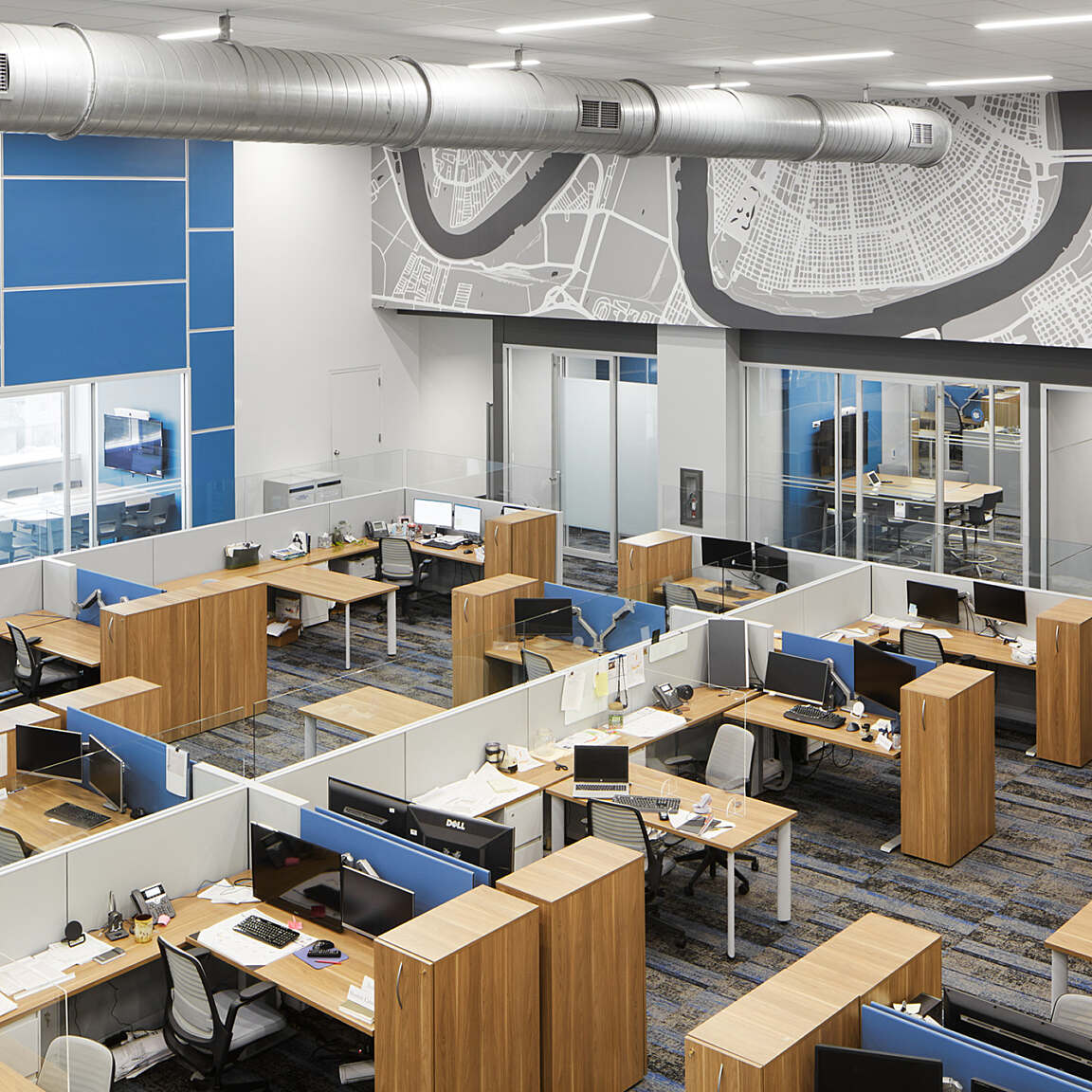 An extensive office space renovation was completed to house the new corporate headquarters of Bernhard MCC, one of the nation’s largest privately-owned engineering and contracting firms. The project expertly transformed an existing structure in Metairie, Louisiana, which had seen a wide variety of former tenants, into a strategically branded corporate office space.