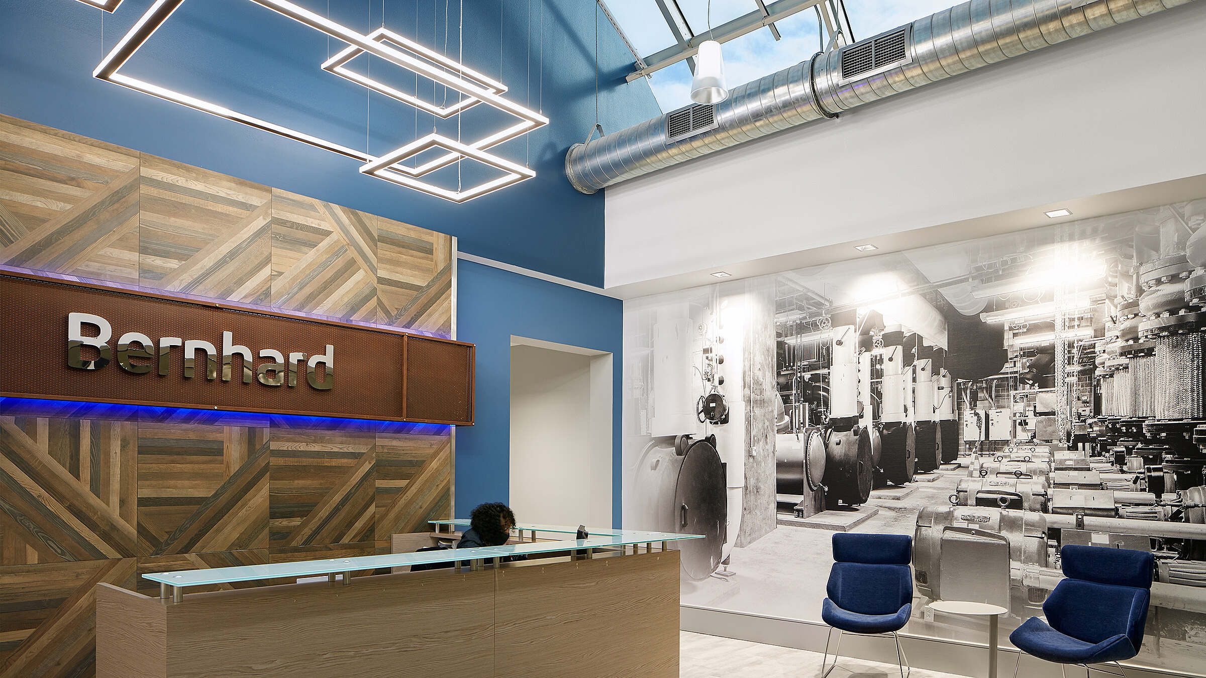 The primary impetus for the project was to consolidate the majority of Bernhard’s workforce into one location to promote collaboration. Relocating to the 36,000 SF space also gave the firm an opportunity to modernize with a more open office environment. With Bernhard serving as the project’s general contractor and mechanical engineer as well, the design team developed a client-tailored design that played on the strengths and unique features of the existing space while also reflecting Bernhard’s brand and corporate character.