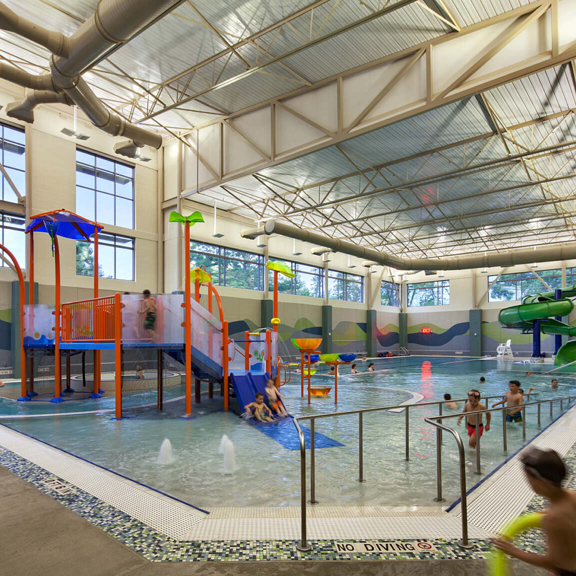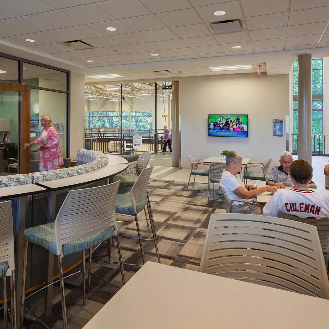 Upon entering the upper-level main lobby, guests are welcomed with expansive views of the gymnasium and natatorium below. The upper level features a running and jogging track that encircles the two-court gymnasium, providing a scenic and energizing exercise experience. Secure access to the building’s activity zones is monitored from the centrally located control desk, ensuring a safe and organized flow throughout the facility. In addition to fitness areas, the upper level includes accessible “free zone” spaces such as the parks and recreation offices, meeting rooms, a game room, and an aerobics room—all open to visitors without requiring check-in.
