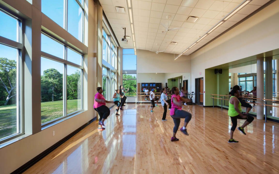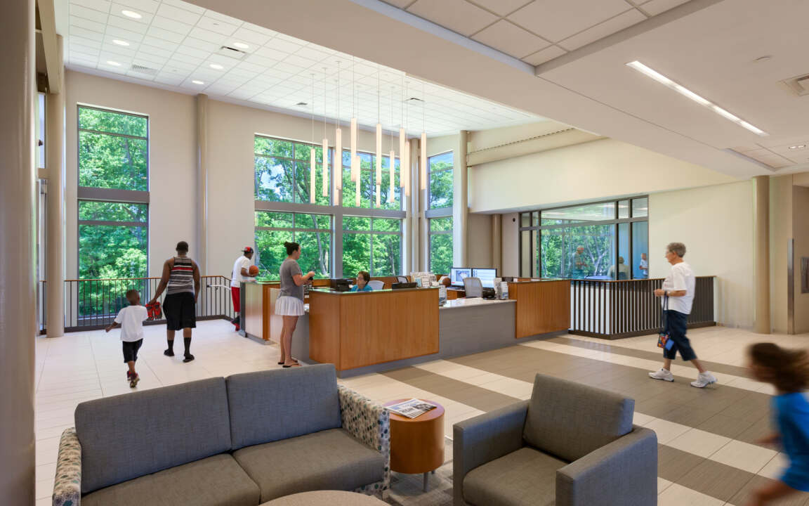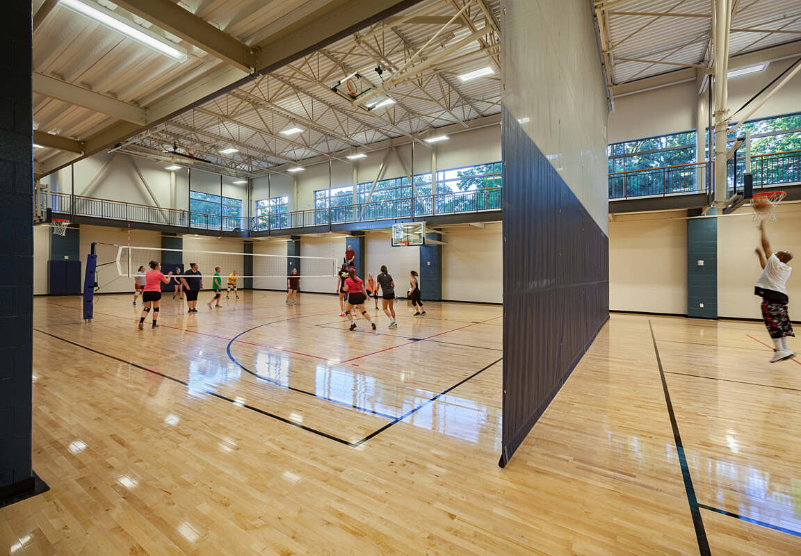 The lower level is dedicated to high-energy activities and fitness, featuring a spacious cardio and free weights area, a two-court gymnasium, and a dedicated party room for events and celebrations. The natatorium, visible from the lobby above, is a key highlight of the center, providing aquatic fitness and recreation opportunities for the community. Thoughtfully designed to maximize accessibility, functionality, and engagement, the Bridgeton Recreation Center delivers a modern and welcoming environment that encourages an active and connected lifestyle.