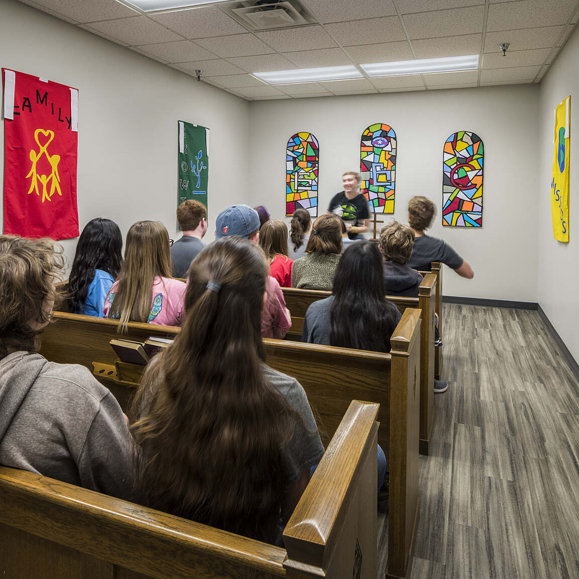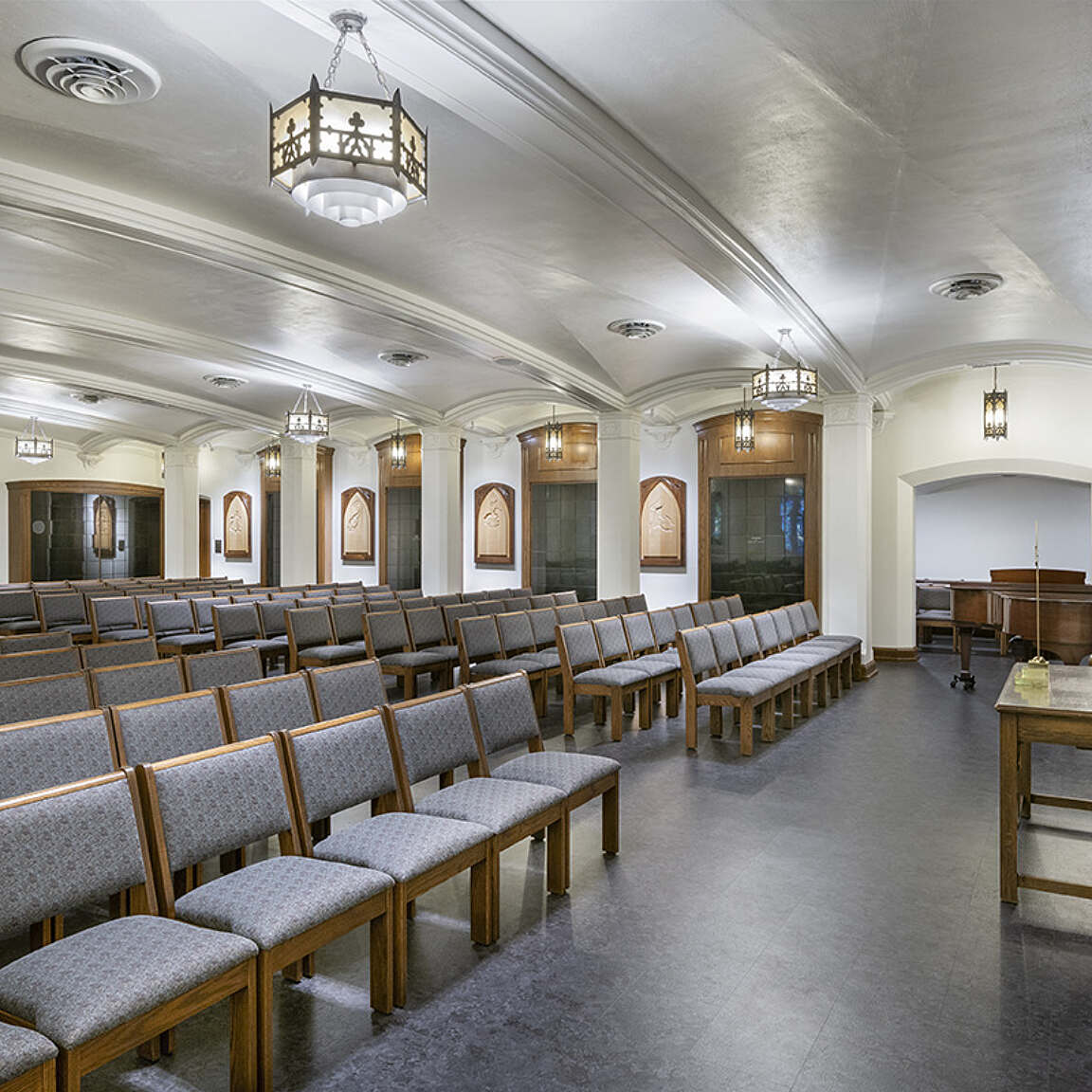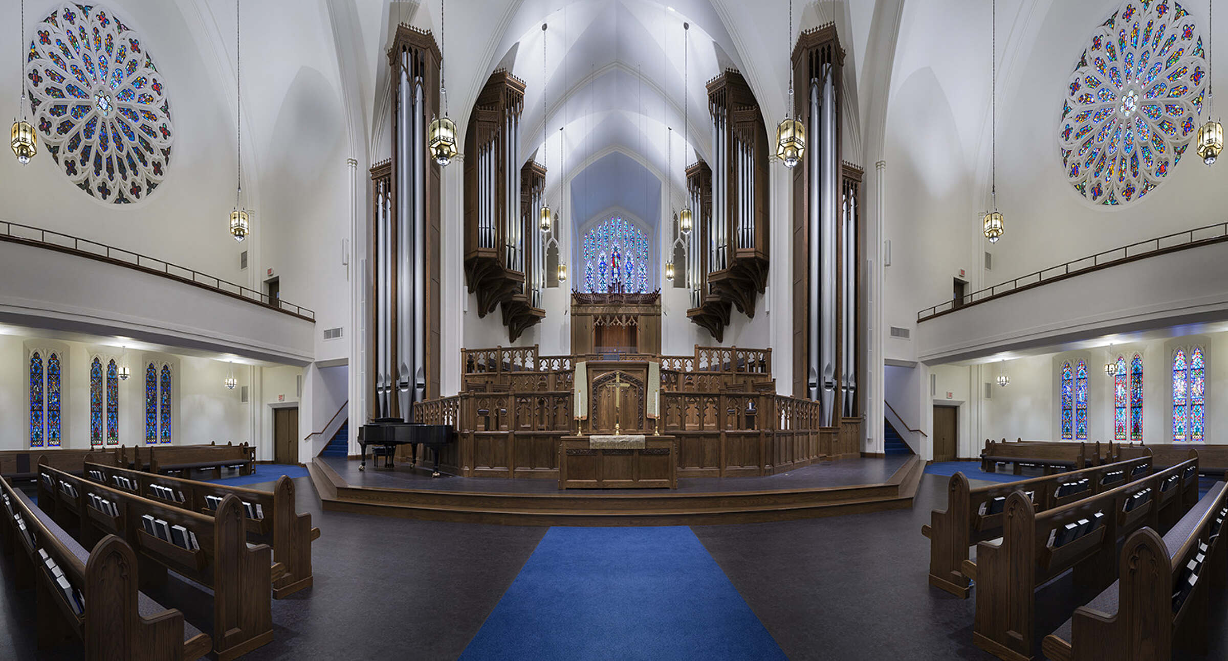 Extensive repairs were made to damaged plaster ceilings and walls, and seating was upgraded with new pews. The altar area was reworked for improved functionality and compliance with building codes.