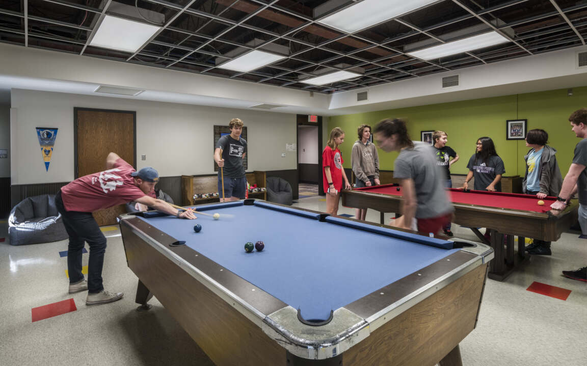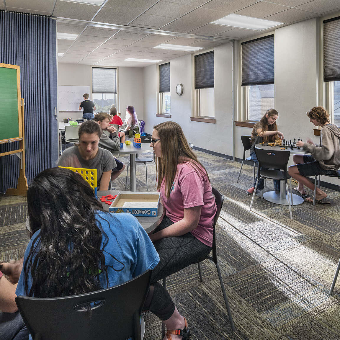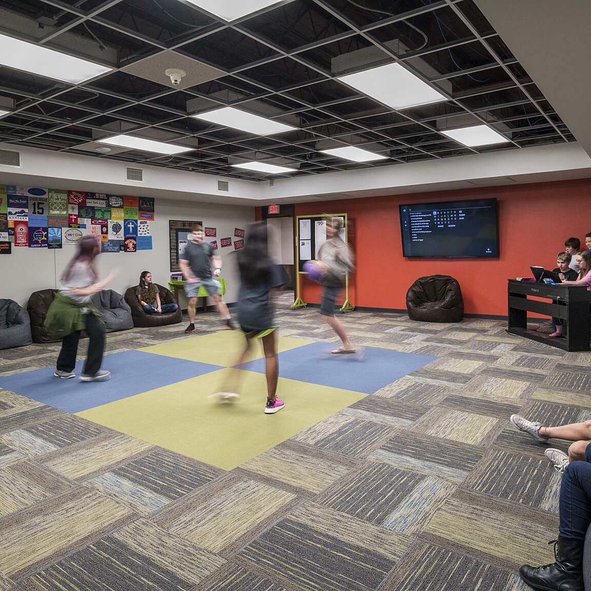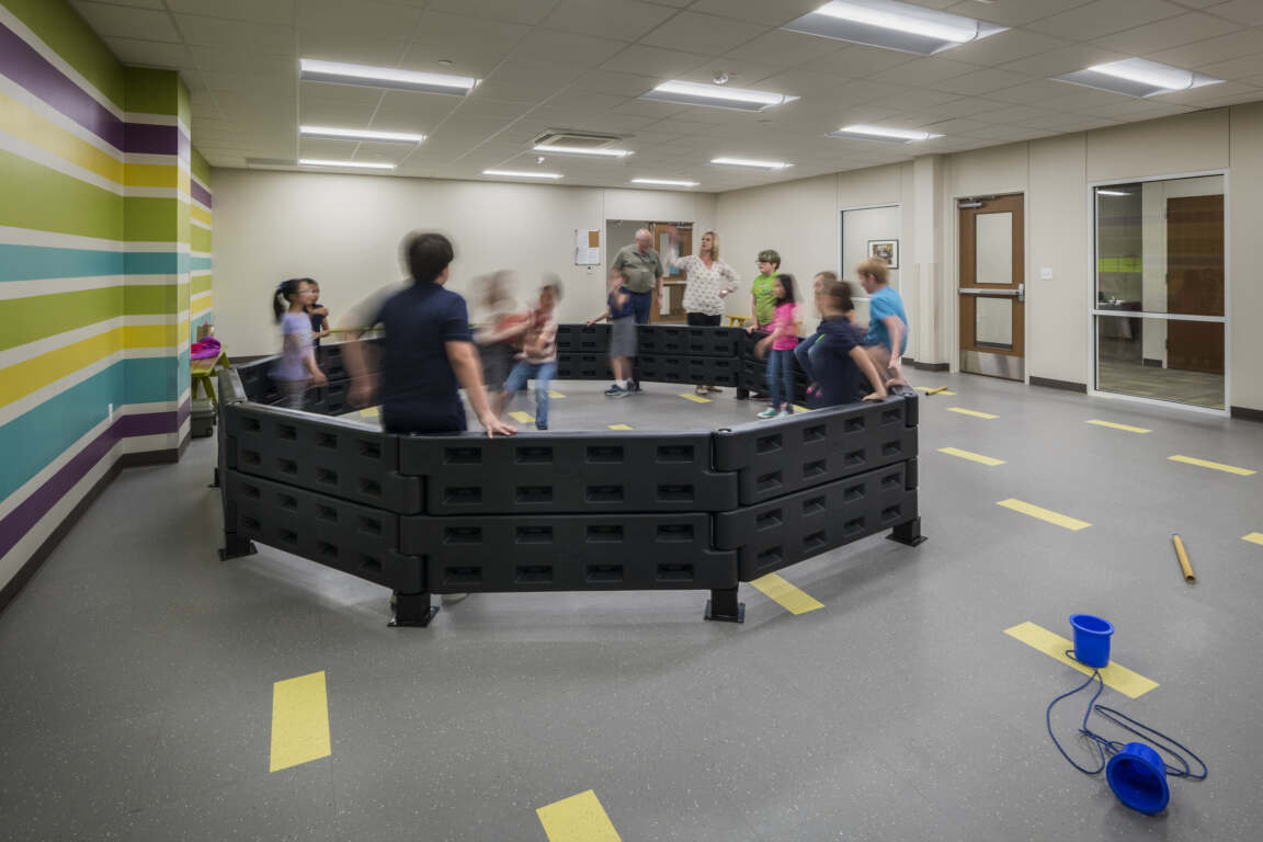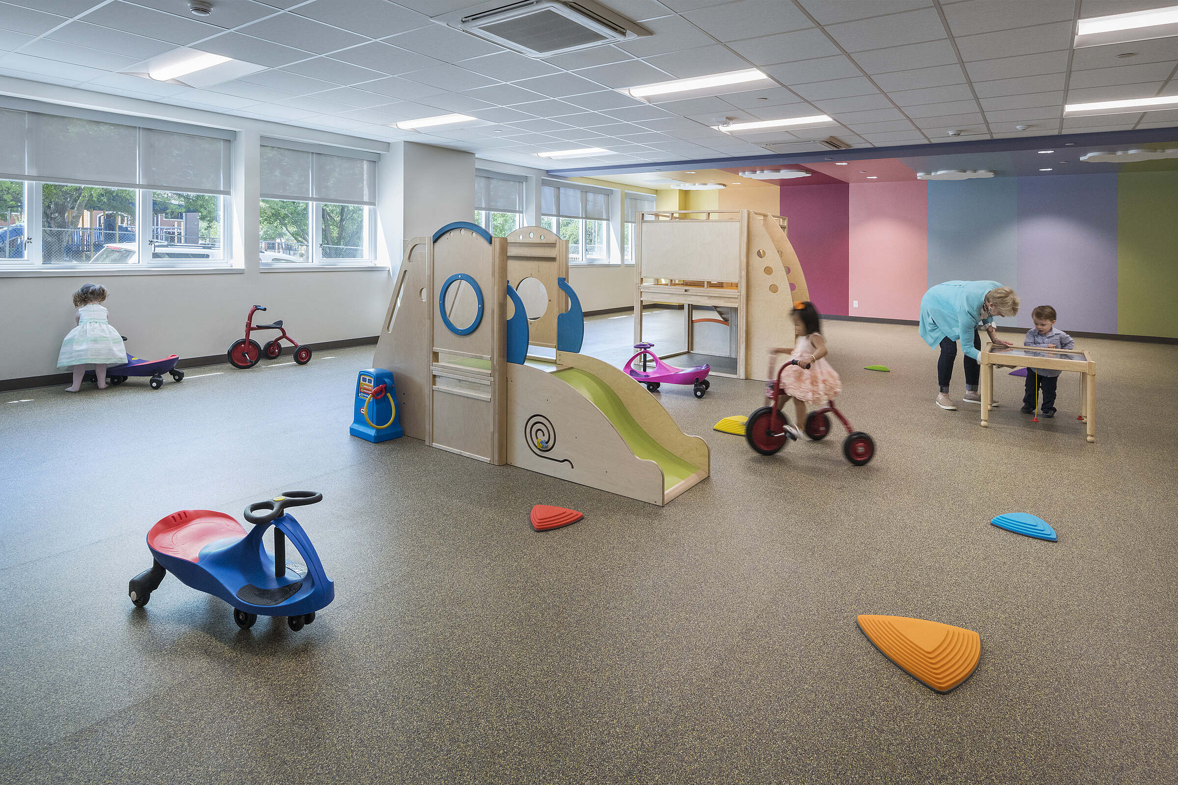 The first level is dedicated to younger children and includes a new playroom with a mural wall and quiet spaces designed for durability and easy cleaning.