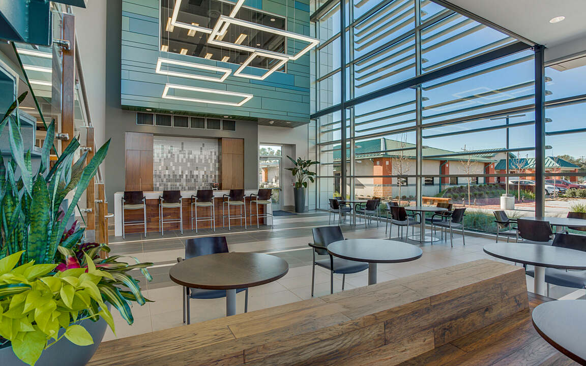 To create a welcoming and highly visible point of entry, a striking two-story lobby was developed using glass, architectural louvers and metal wall panels. The bright, soaring lobby serves as a natural congregation space, complete with a coffee bar and multiple seating areas for fellowship and impromptu meetings.