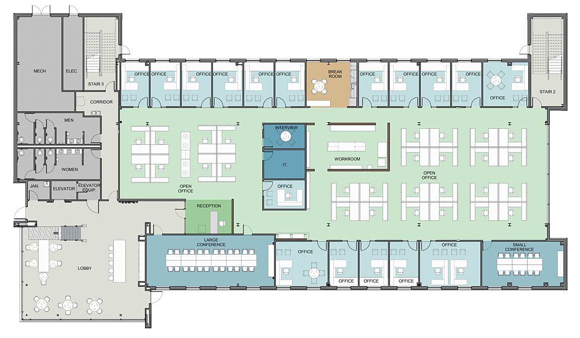 Steel and wood screens create a barrier between the reception area and open office spaces, which facilitate communication and collaboration as well as enhance productivity. The shared areas also feature acoustic ceiling treatments to temper noise and help employees focus. Private upper-level management offices and conference areas are located along the building’s perimeter, allowing for views to the exterior.