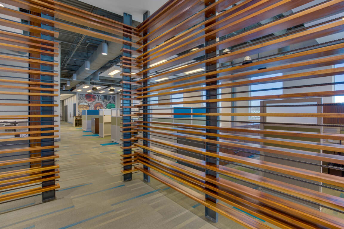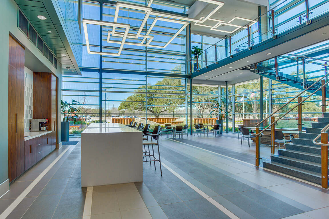 As the project scope also encompassed an interior renovation of the existing spaces, our firm developed a contemporary design that provided both freshness and consistency. A harmonious variety of floor finishes, wall finishes, and lighting placements create a cohesive interior/exterior environment. Custom-designed wall coverings throughout speak to the company’s many construction disciplines.