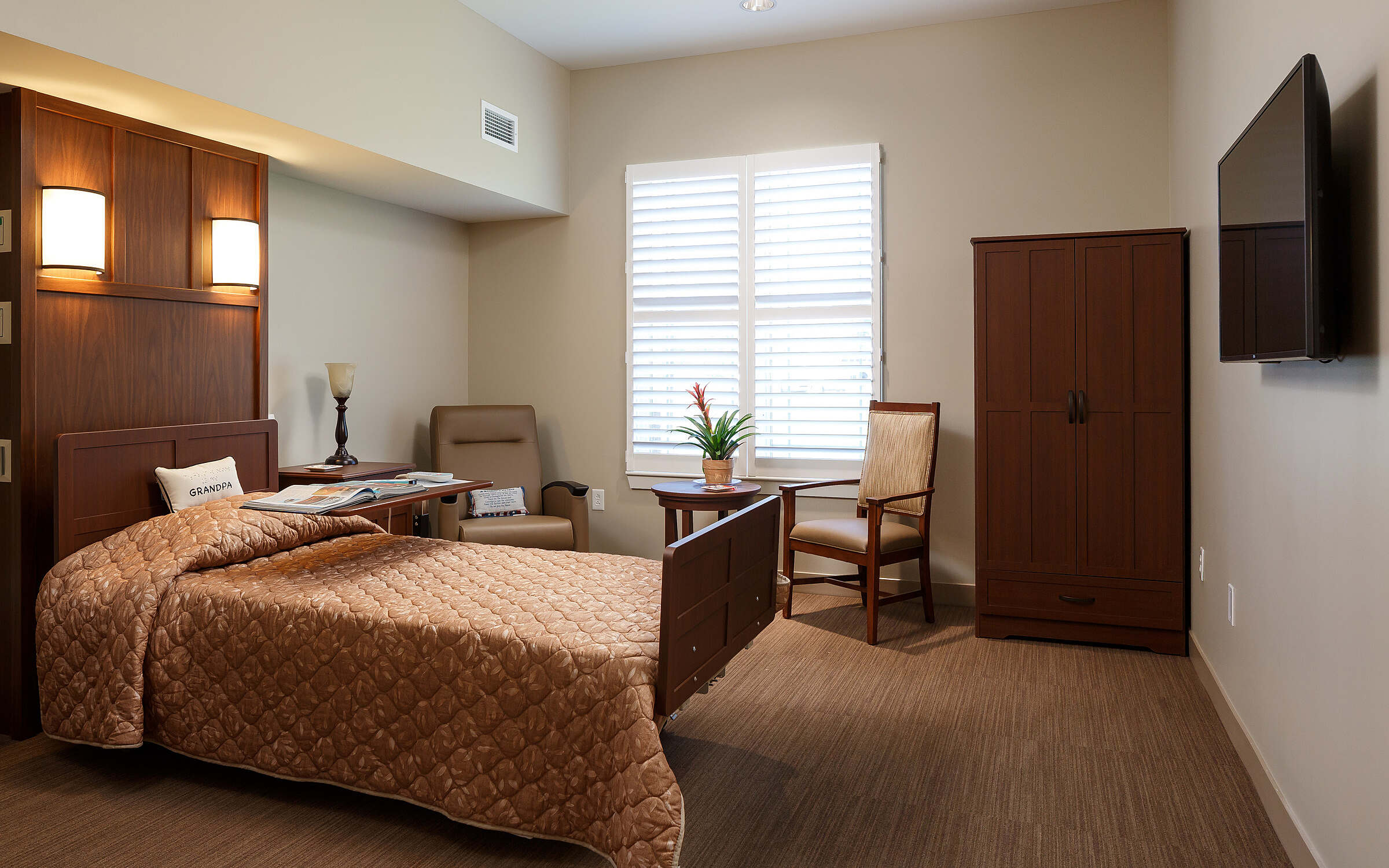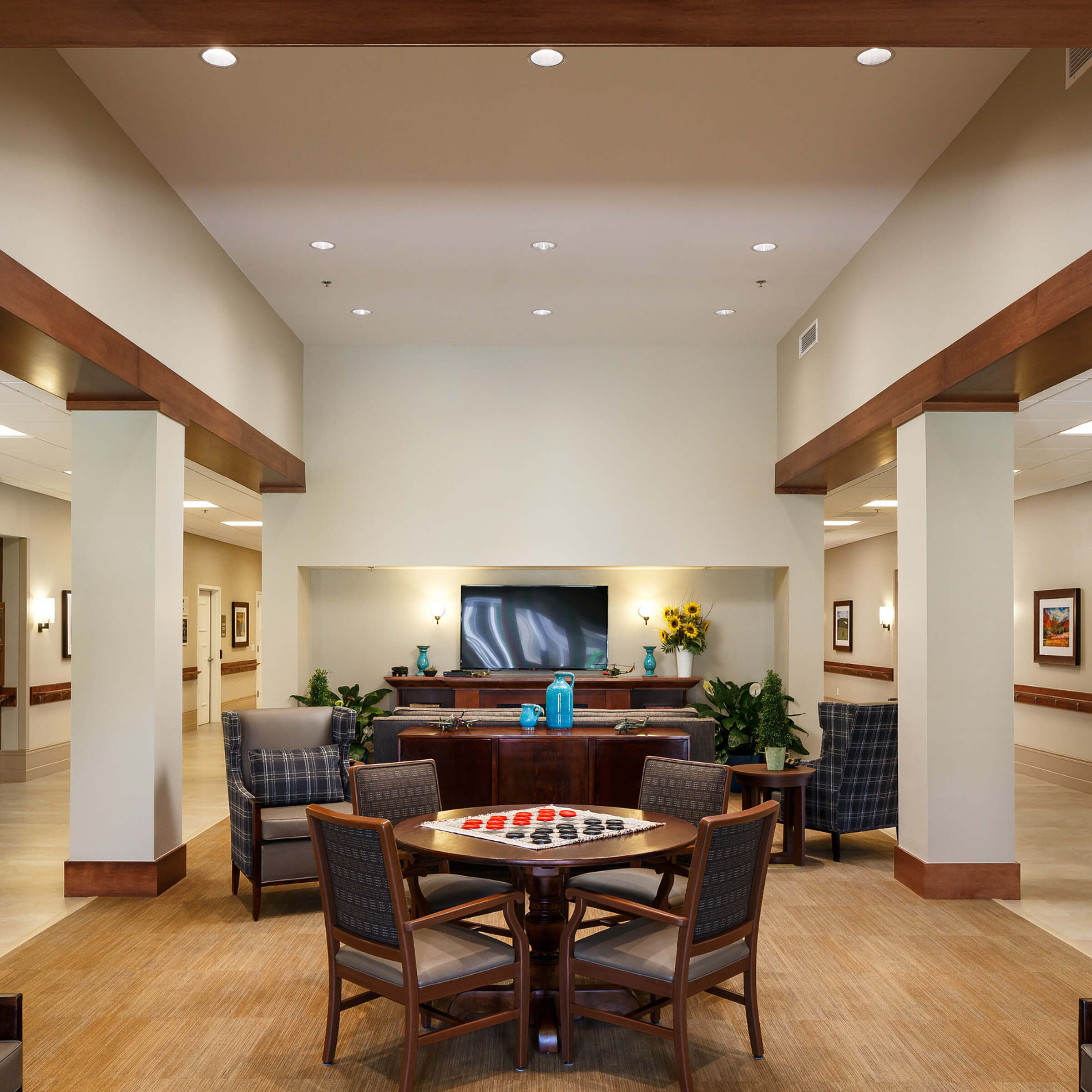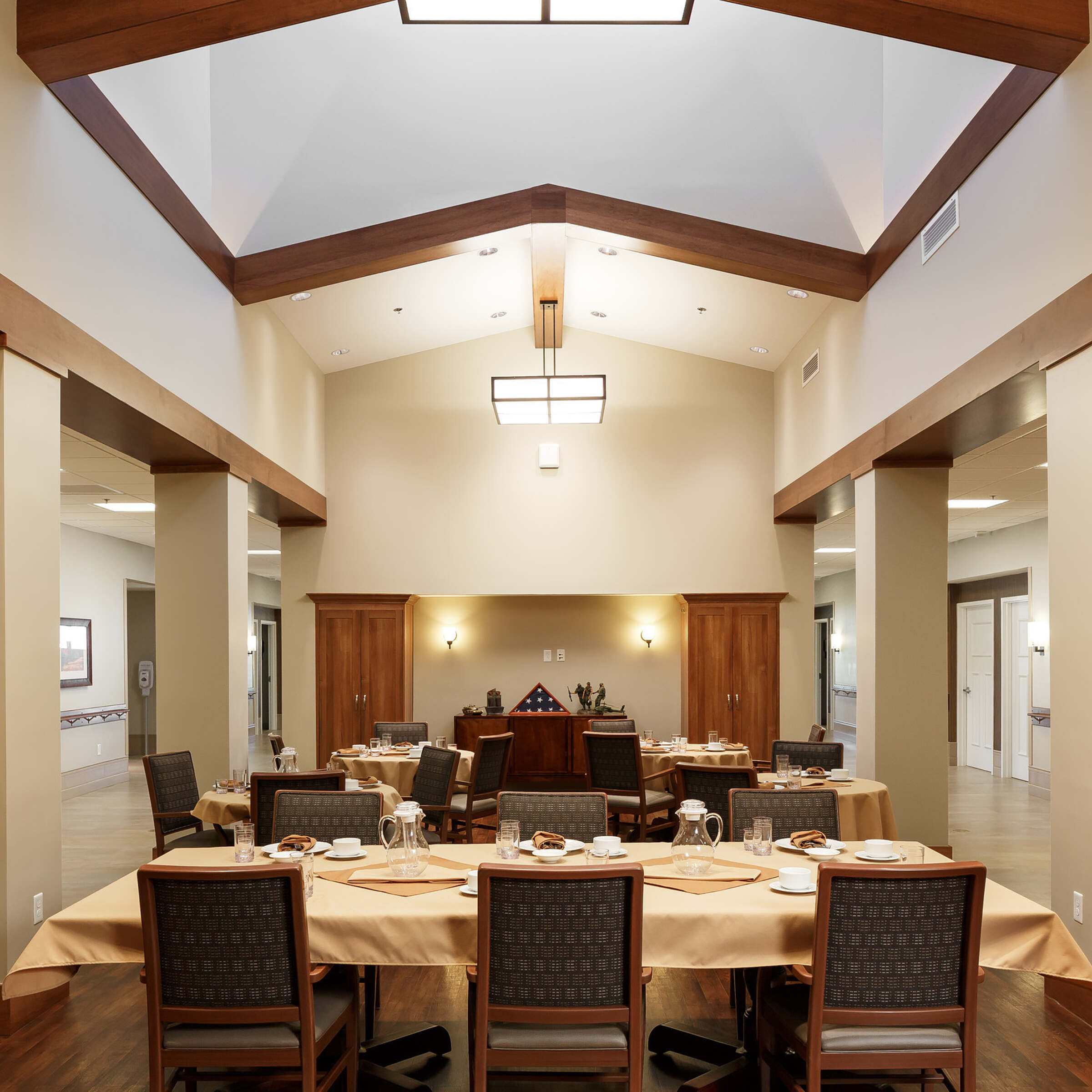 Located on 115 acres, this 131,000 SF facility is designed to blend in and complement the surrounding vernacular architecture of Fort Knox and the nearby town of Radcliff. The intent of this project was to create an environment of care that fulfills the vision defined in the Department of Veterans Affairs, Office of Facilities Management, Community Living Center Design Guide. The first and foremost intent of the design is to create a home-like environment for our veterans, their family and friends.