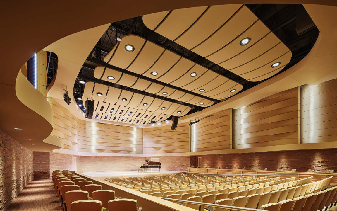 The building features local materials that reference and reflect the surrounding landscape and integrates the stacked stone retaining wall design found throughout the campus and region. That same stone texture continues into the lobby and flanks both entrances to the concert hall. Texturized plaster panels (painted to mimic red dirt or brick) and undulating panels in and around the concert hall create a wavy texture, evoking the region’s ever-present winds sweeping over the prairie grasses. Painted “clouds” on the ceiling mask technical equipment and provide sound reflection.