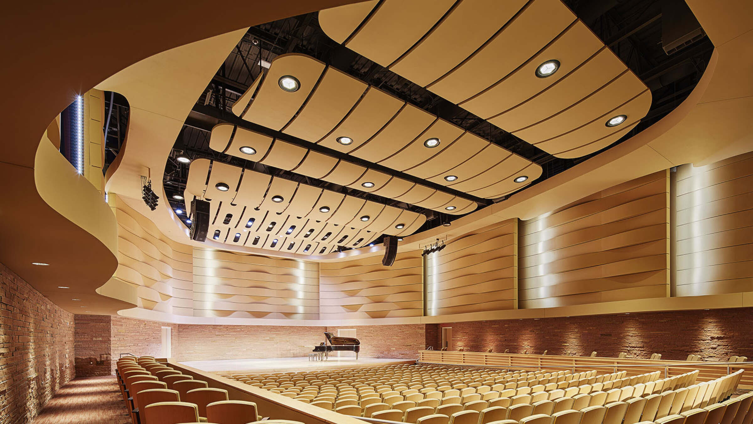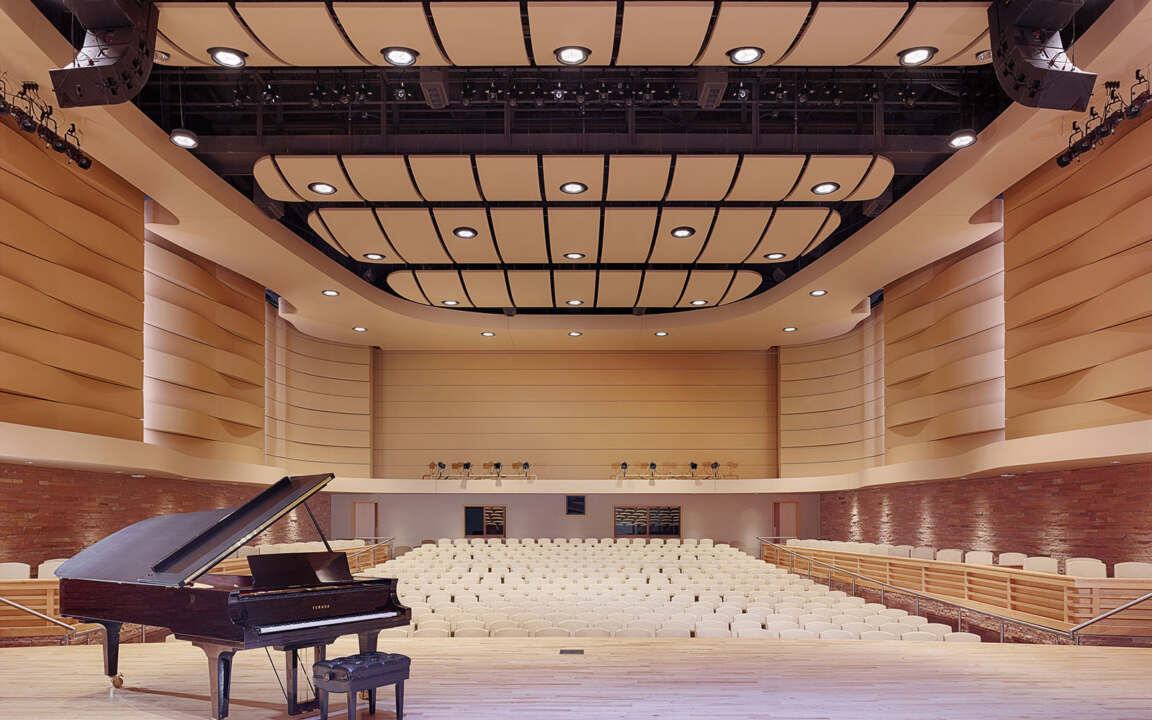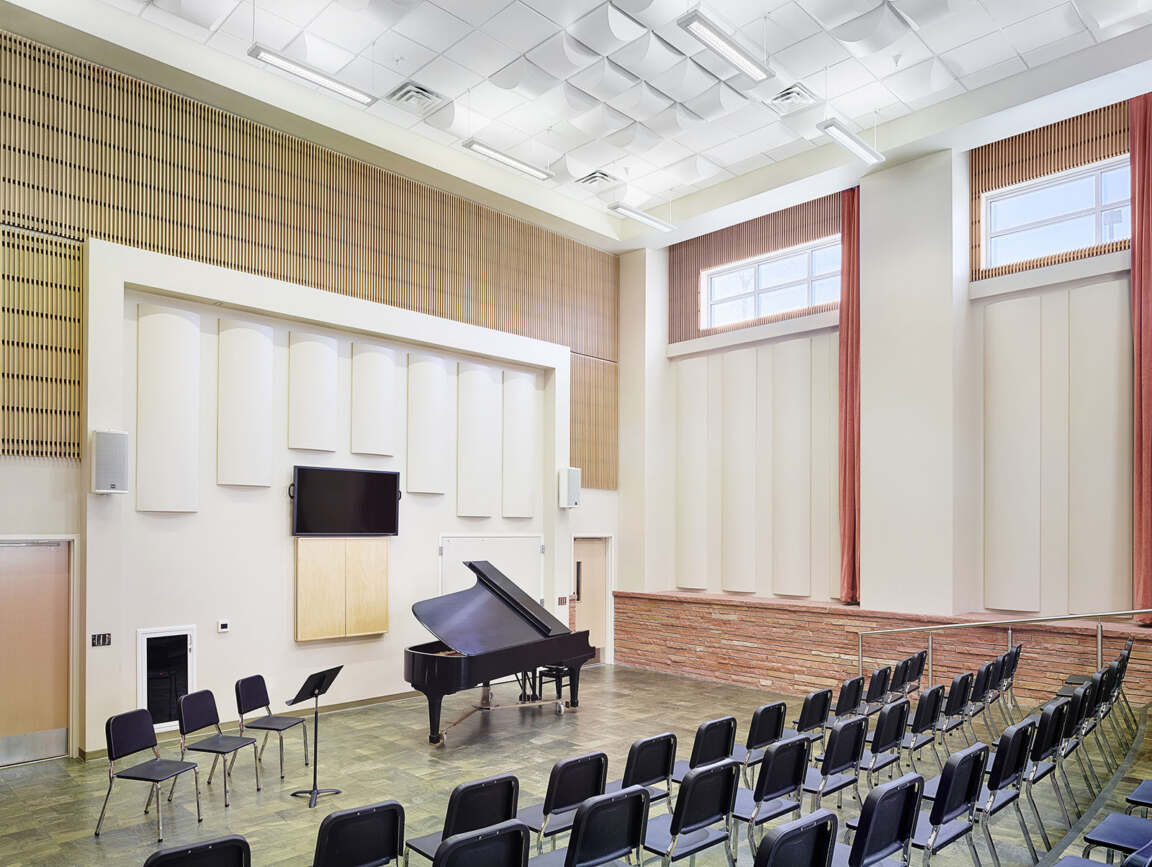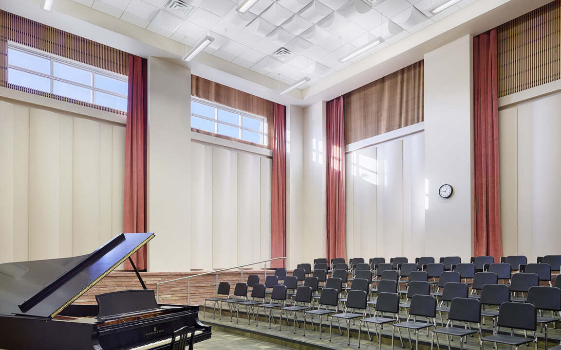 The tiered choral rehearsal space also accommodates small recitals, featuring large drapes that change the room’s acoustics as needed. Wood slats at the tops of the walls warm the space and also break up sound.
