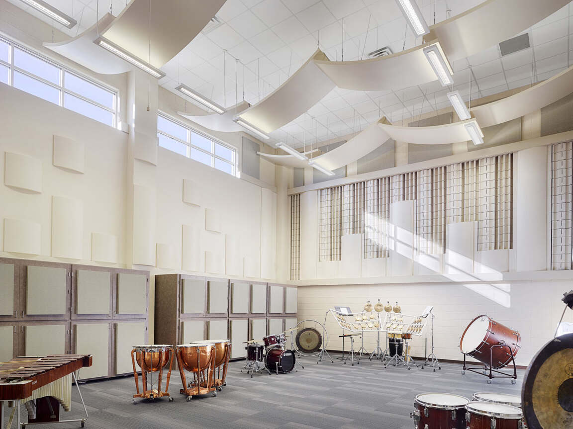The percussion rehearsal hall uses a variety of methods to diffuse and absorb sound, including acoustic block and alternating soft- and hard-shaped acoustical panels. Instrument storage cabinets are faced with sound-absorbing panels, and curved ceiling diffusers further disperse sound.