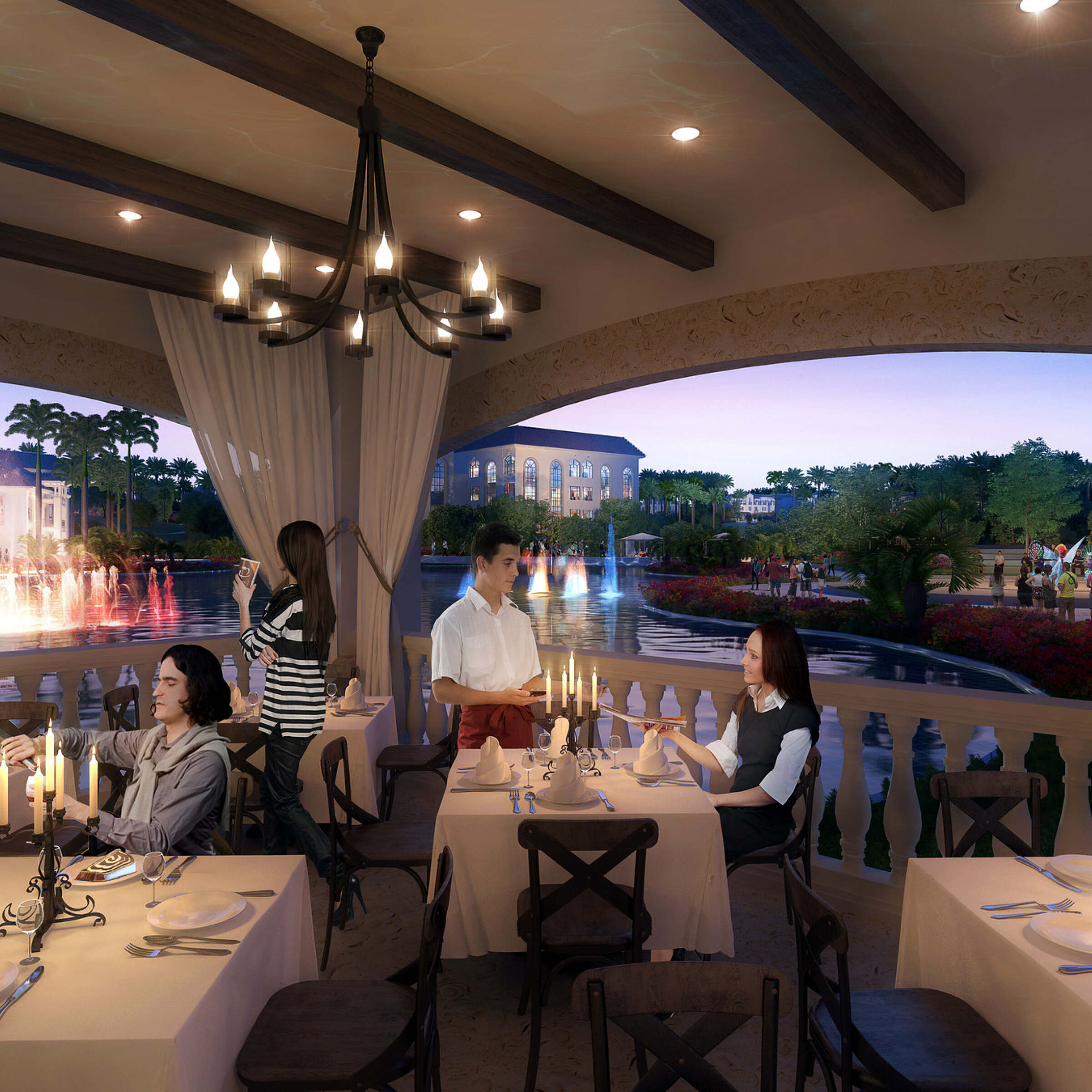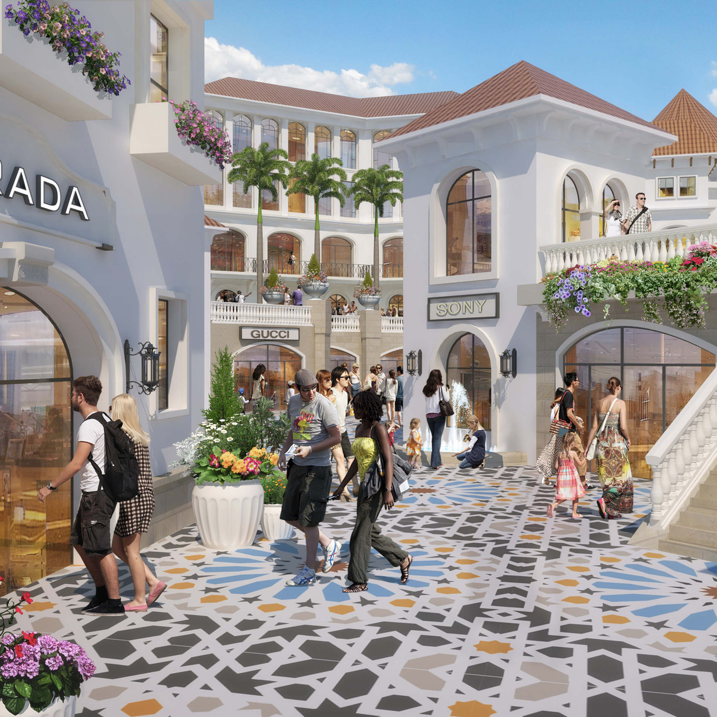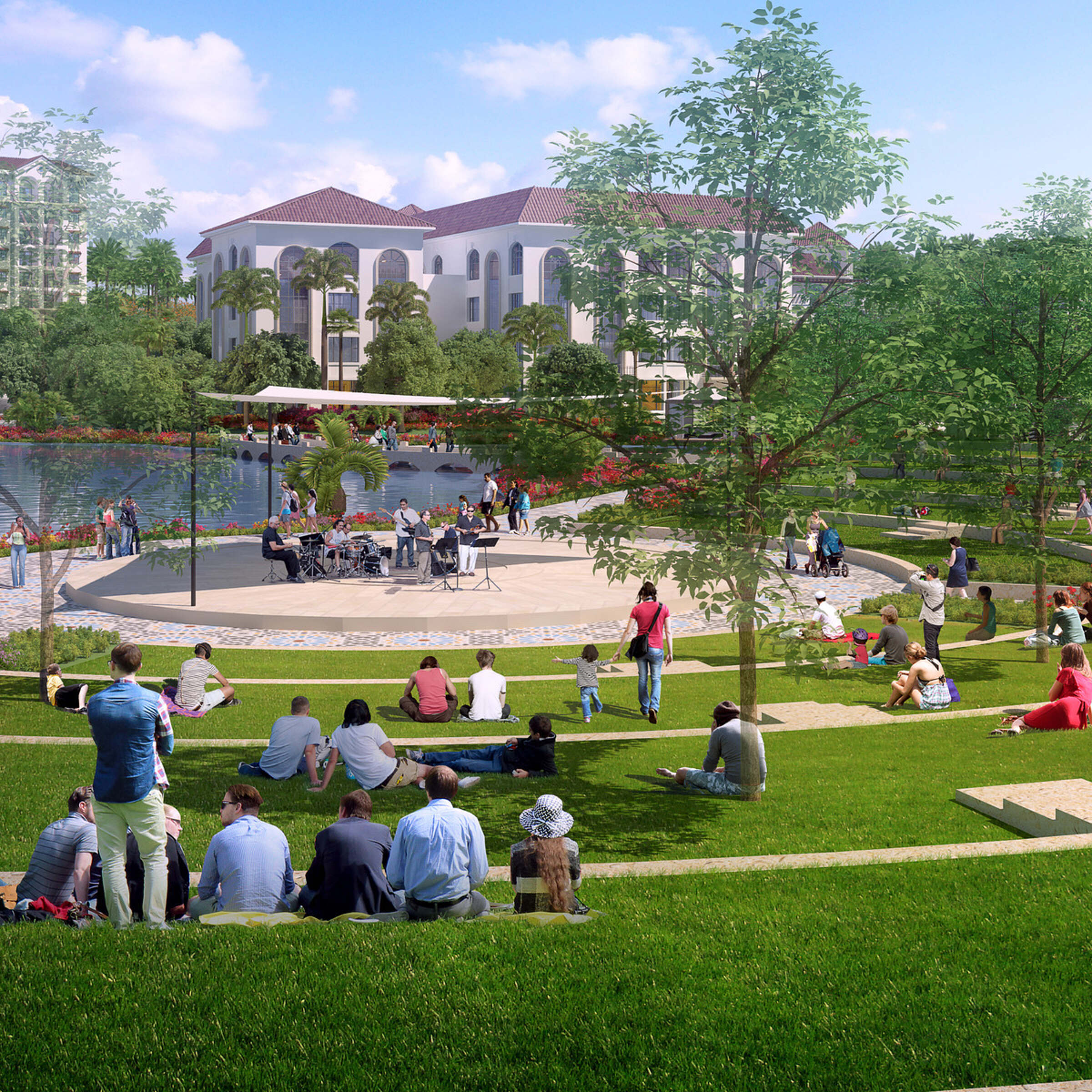 The Apartment Homes, which ring the outer boundary of the Village, rise up to seven stories on the east and west side, providing a spectacular panoramic view of the New Capital City in the distance. Reinforcing the Sardinian theme, the Village is composed of four distinct environments, Grande Viale/Porta Grande (Grande Avenue and Main Entrance), Via Corsia/Gardino Romantica (Hillside Lane and Courtyard Garden), Via Pendio/Cala Bougainville (Hillside Walkway and Bougainvillea Court), and Via Della Lago/Piazzetta Della Lago (Lakeside Promenade and Overlook), portraying an Italian hillside town streetscape. The waterfront promenade, courtyards and plaza design elements, serving to create a unique and memorable experiences on each terrace level.