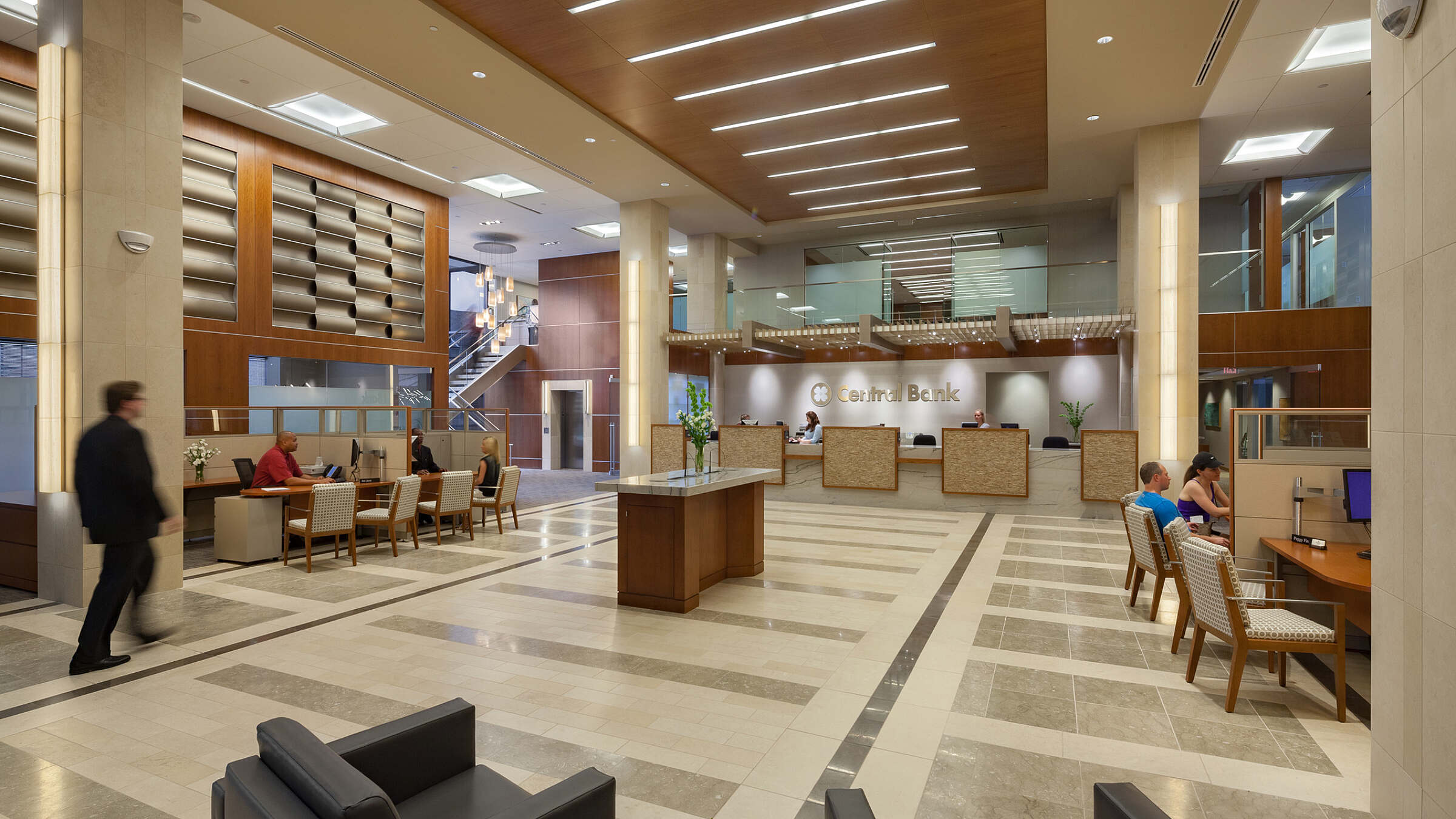 Our planners evaluated a range of factors, including the work style and functions of each department. Changes in the banking industry as a whole are driving a reduced emphasis on retail/transactional banking functions (especially teller windows) at Central Bank. An increased focus has been placed on financial services including personal investment and commercial banking. As a result, the redesigned branch incorporates changes in the ratios of private offices to open offices, consolidates staff groups by function, and presents an updated aesthetic to clients.