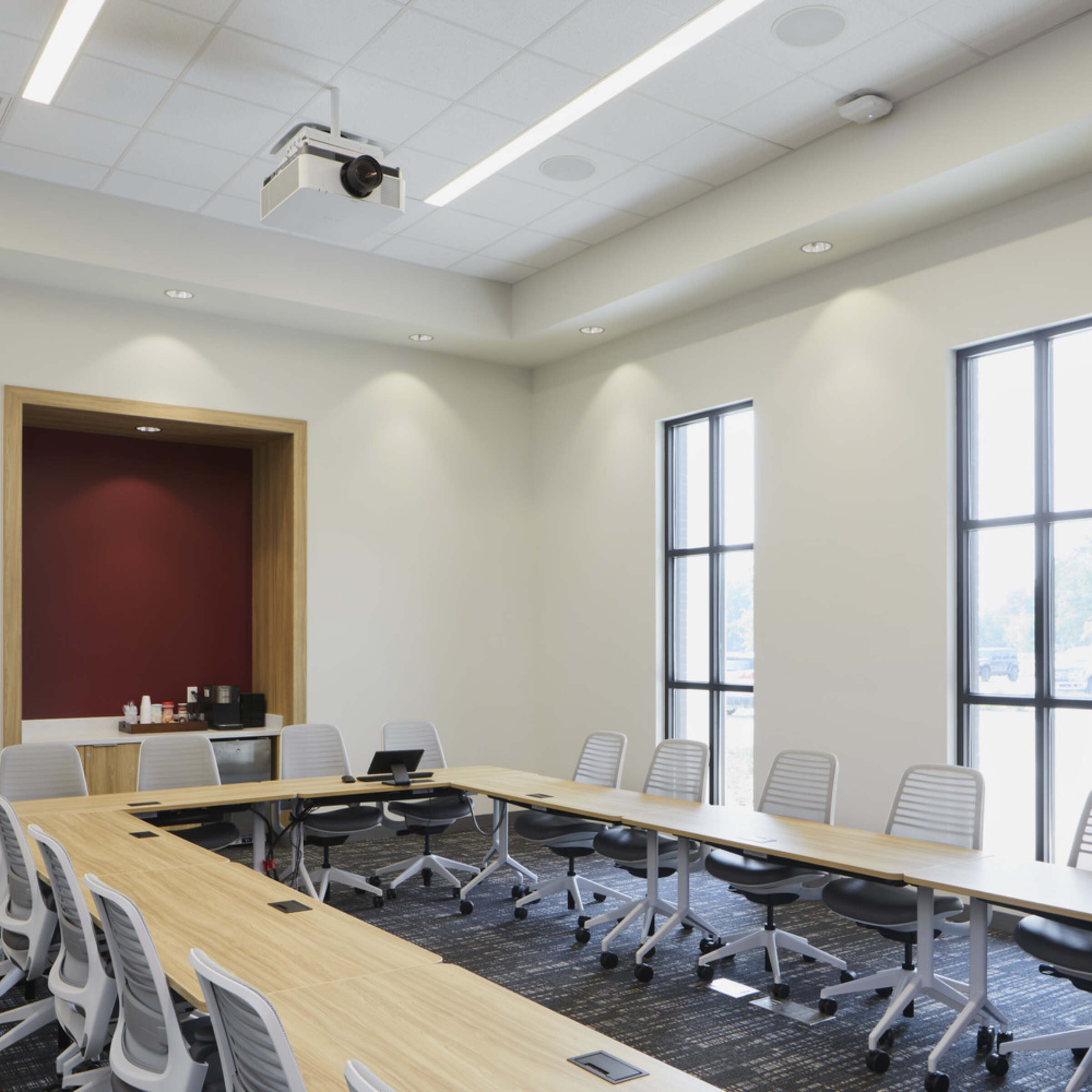 The meeting room prominently displays the Central Community School System’s logo, while bright lighting and subtle wood touches add warmth and sophistication to the space, creating an ideal place for productive school board discussions.