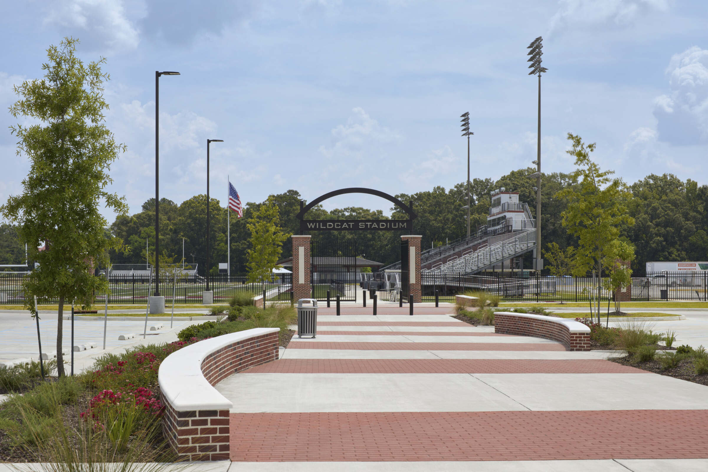 Extensive upgrades to the High School's Football Stadium aim to enhance accessibility and convenience for both staff and visitors as well as upgrade the overall aesthetics of the complex. Improvements include newly paved parking areas, a landscaped promenade, an inviting stadium entry, and a convenient concession stand.