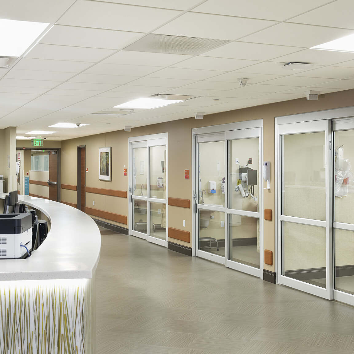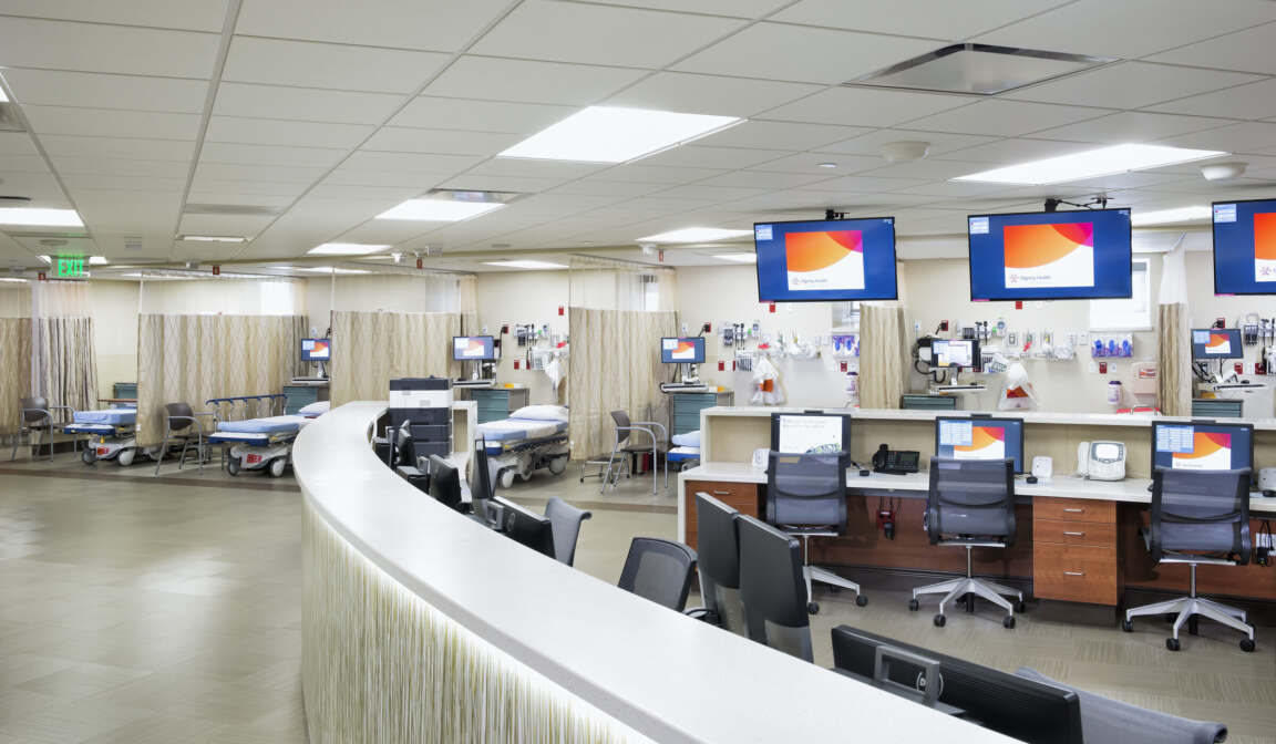 The new 42,000 SF ED is tailored to meet the requirements of Accountable Care and is designed to adapt to seasonal fluctuations. Centralized Nurse stations promote collaboration and efficiency in care delivery, while a Quick Look and Split Flow plan facilitate timely care, admission, or discharge. An Intake area streamlines patient evaluation and discharge processes, reducing treat-to-street times.