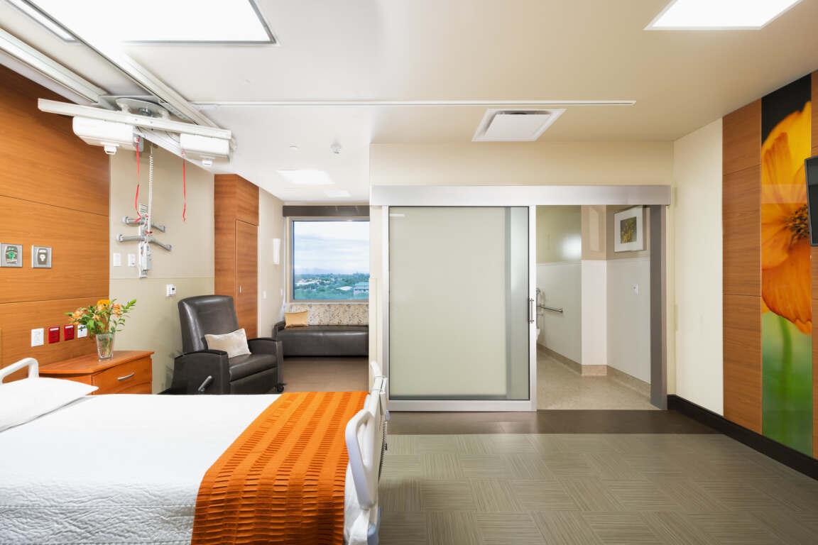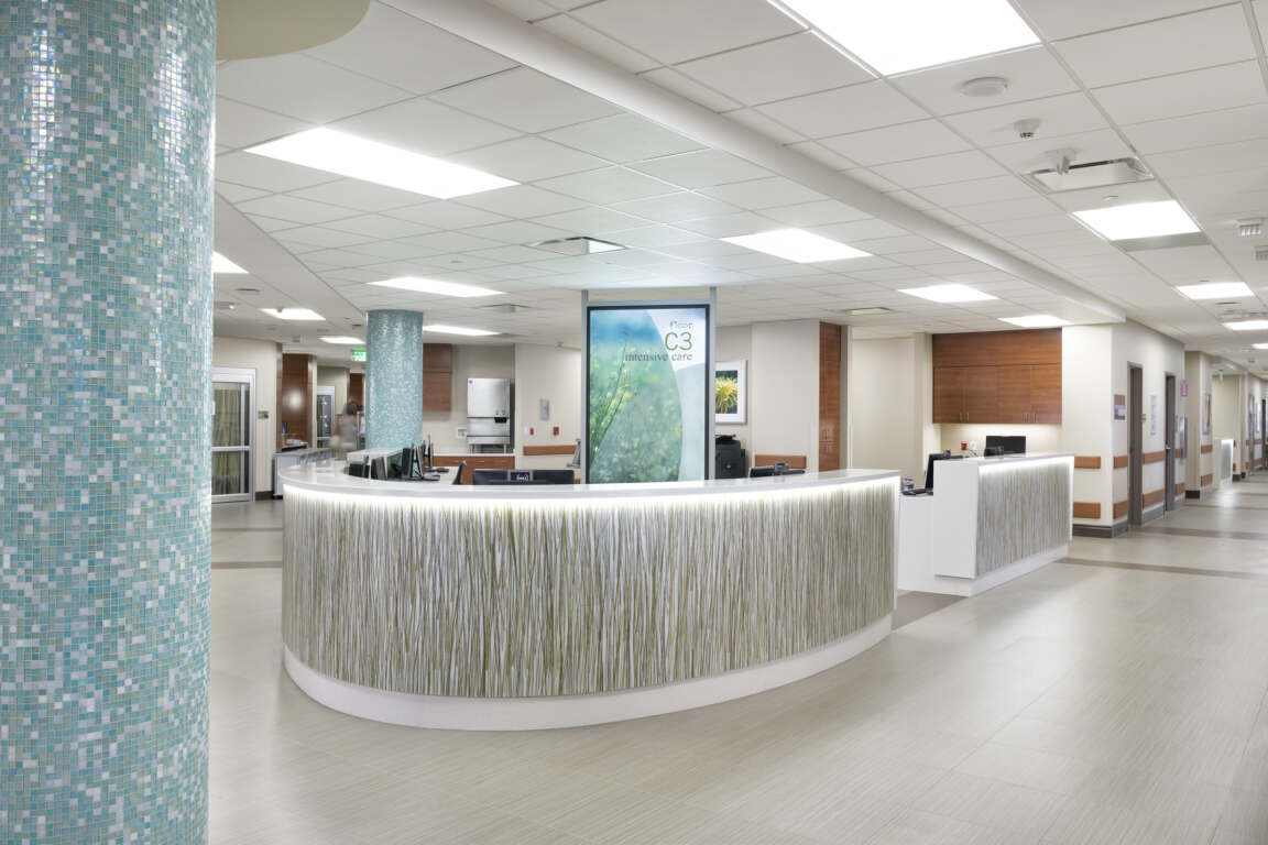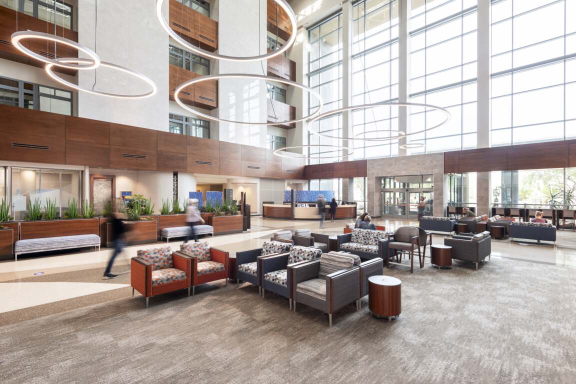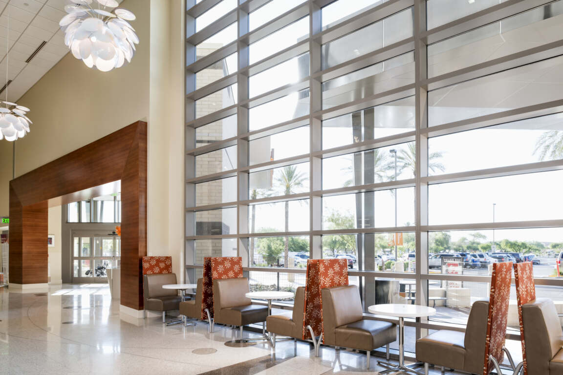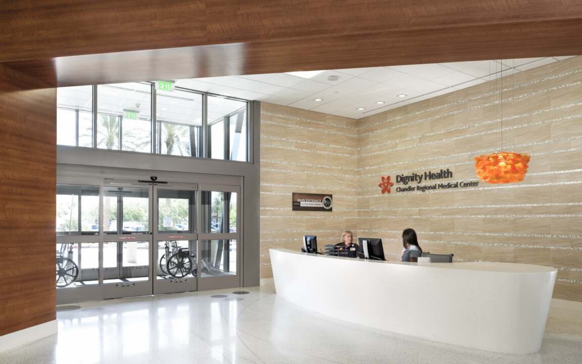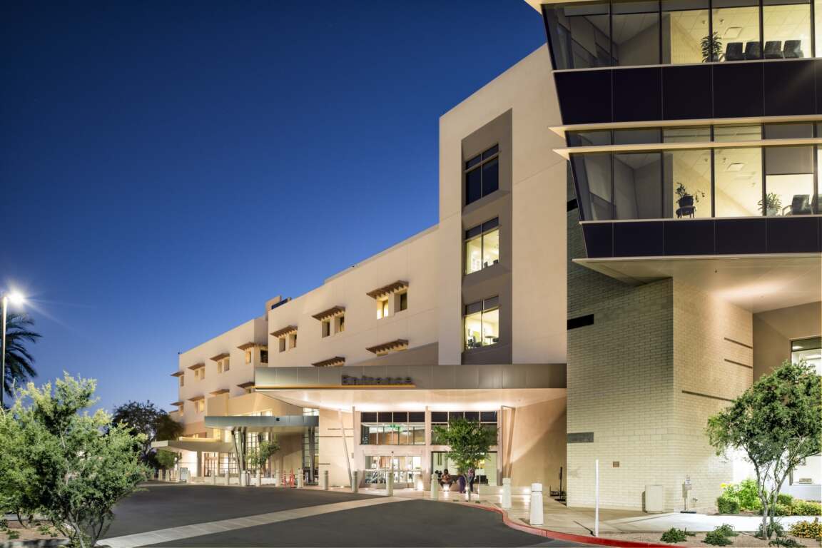 Chandler Regional Medical Center reached a critical capacity level of high occupancy requiring growth to serve the future needs of its patients and community. Increasing capacity in a thoughtful way, focusing on care, increasing operational efficiency, and reinforcing safety, were just a few of the hallmarks Dignity Health wanted in the design of a 176,560 SF expansion to its Chandler hospital. Charged with those hallmarks, architects created a design for the new tower that includes five floors providing a new emergency department, intensive care unit, chapel, and dining area while also adding 96 private rooms. The $125 million expansion of Tower C, spanning 176,560 SF, addresses this need by increasing acute care beds, enhancing the ED capacity, modernizing support areas from the 1980s, optimizing the Spiritual Care space, streamlining public access, and alleviating patient and employee parking concerns.
