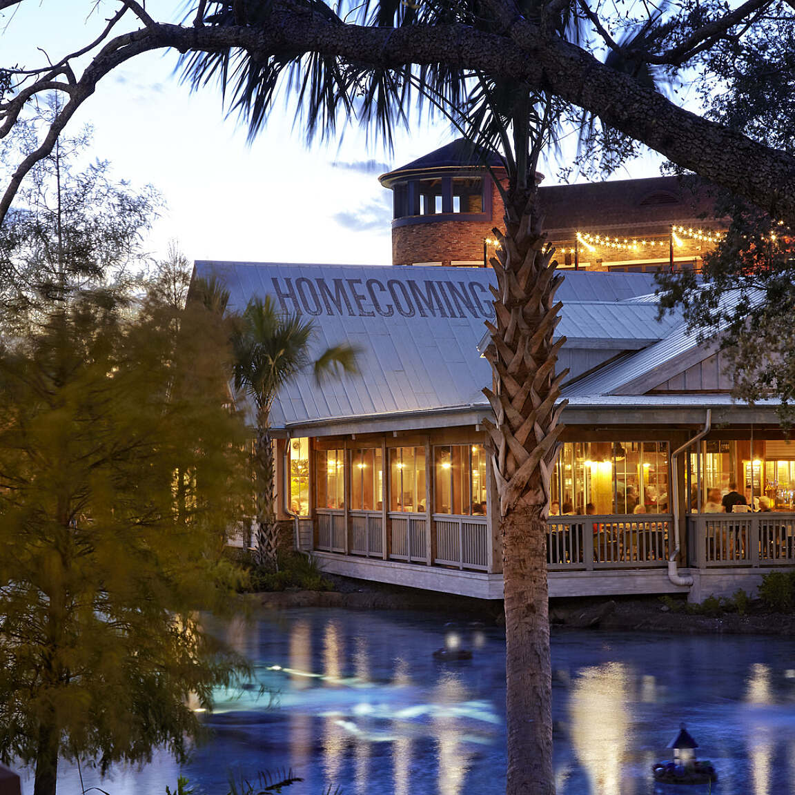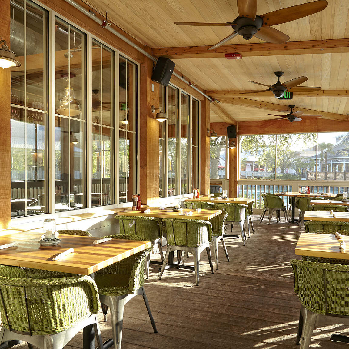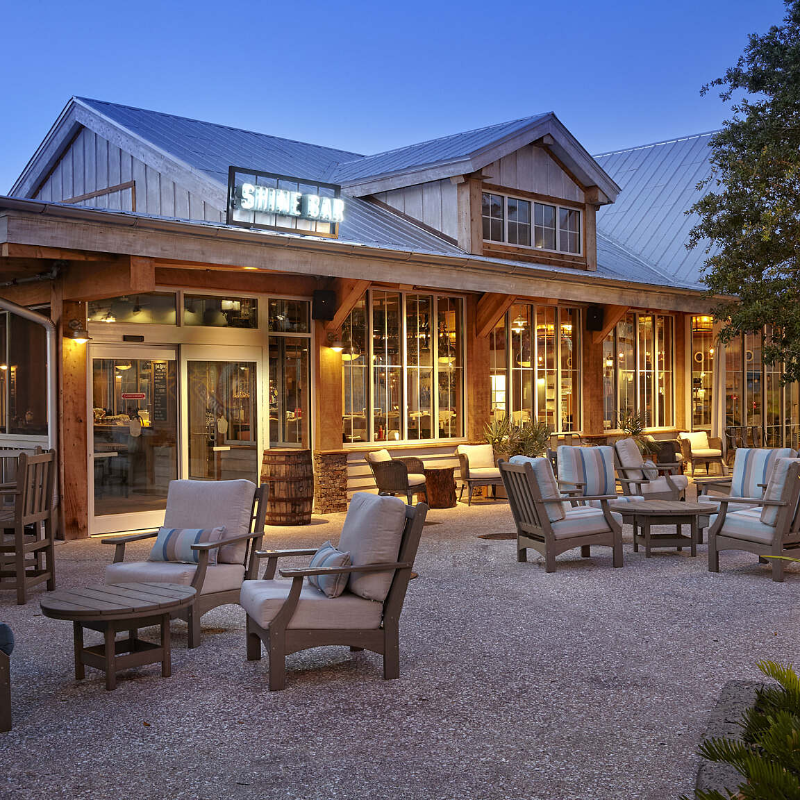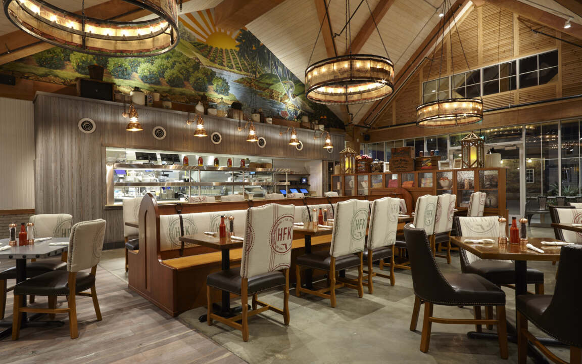 The tin-roofed rustic cabin-style country kitchen is nestled alongside the trees, taking guests back to the old fashioned time-honored days of Florida’s past. Design elements include a wraparound porch with dining and bar overhanging the springs, Florida agriculture themed artwork and murals, an open view kitchen, and custom designed furniture and millwork.