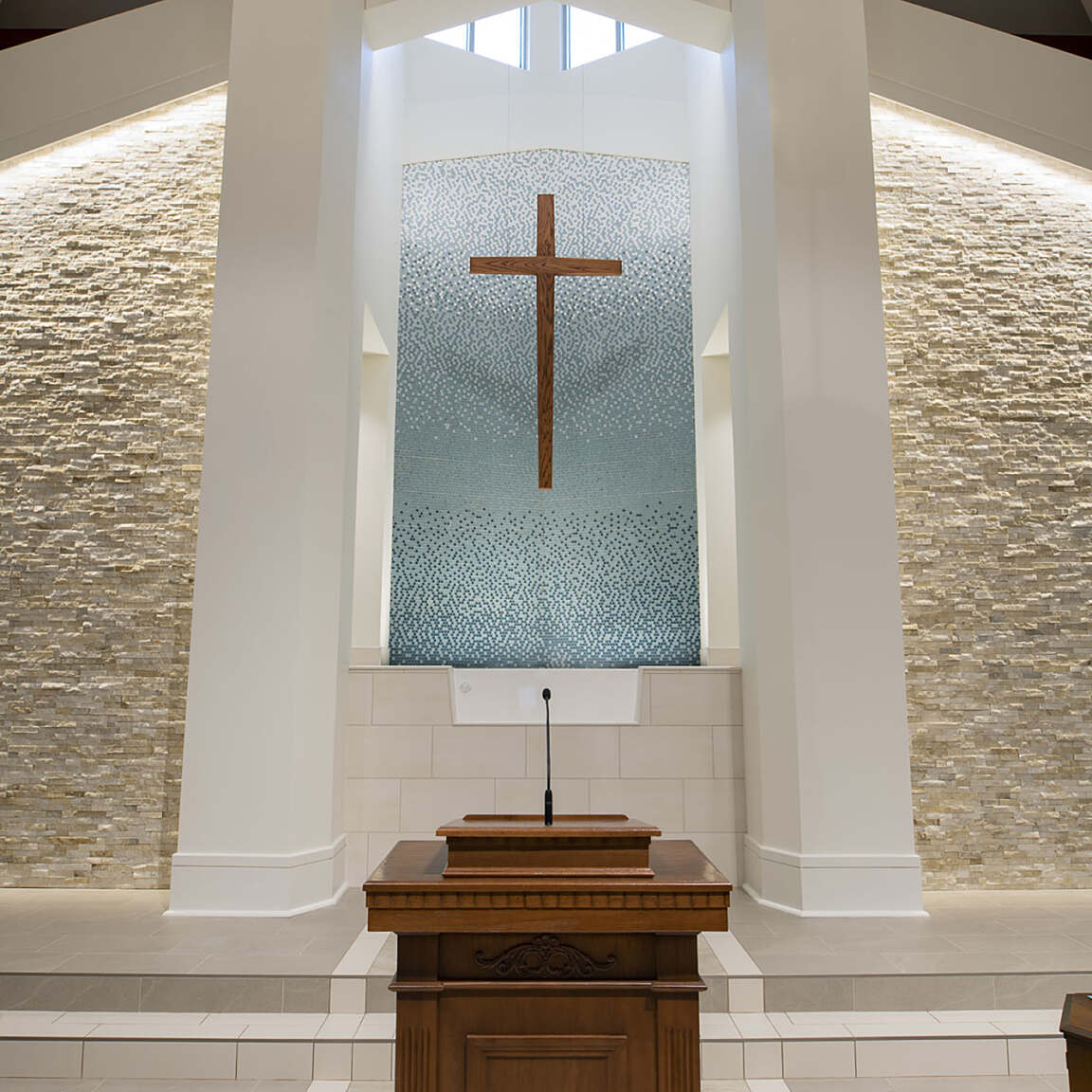 Grace developed a sanctuary design that integrates large storefront windows and a warm color palette.