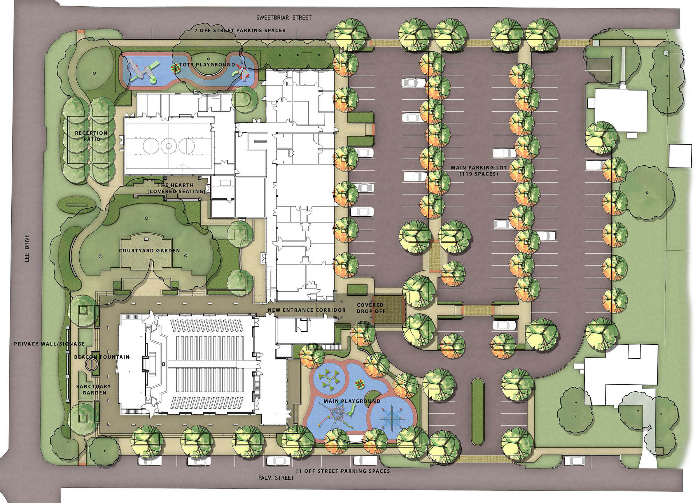 The site itself underwent improvements to drainage and the parking lot was restriped. The relocation of the playground to offer adjacency to the church foyer allows parents to socialize while keeping an eye on their children.