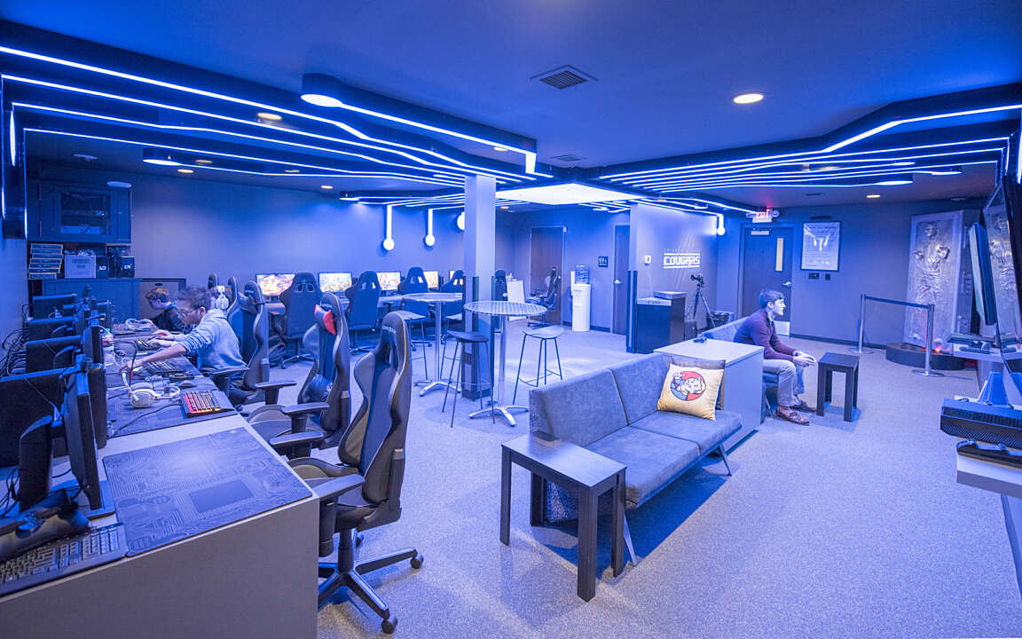 The Game Hut is a 850 SF stand-alone building formerly housing the soccer team’s locker room. The new state-of-the-art campus hub welcomes both gamer-athletes and recreational gamers. Color-changing LEDs let players decide how their space will look. The lighting is designed to not interfere with how players view games on their monitors. The futuristic environment is complete with the latest gaming technology, high-back chairs for comfort, locker rooms, and the Cougars logo on the wall.