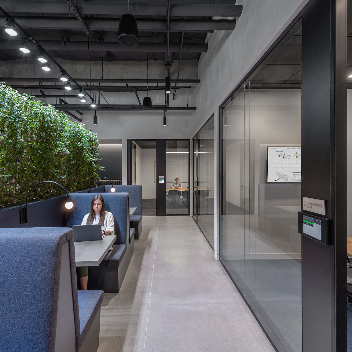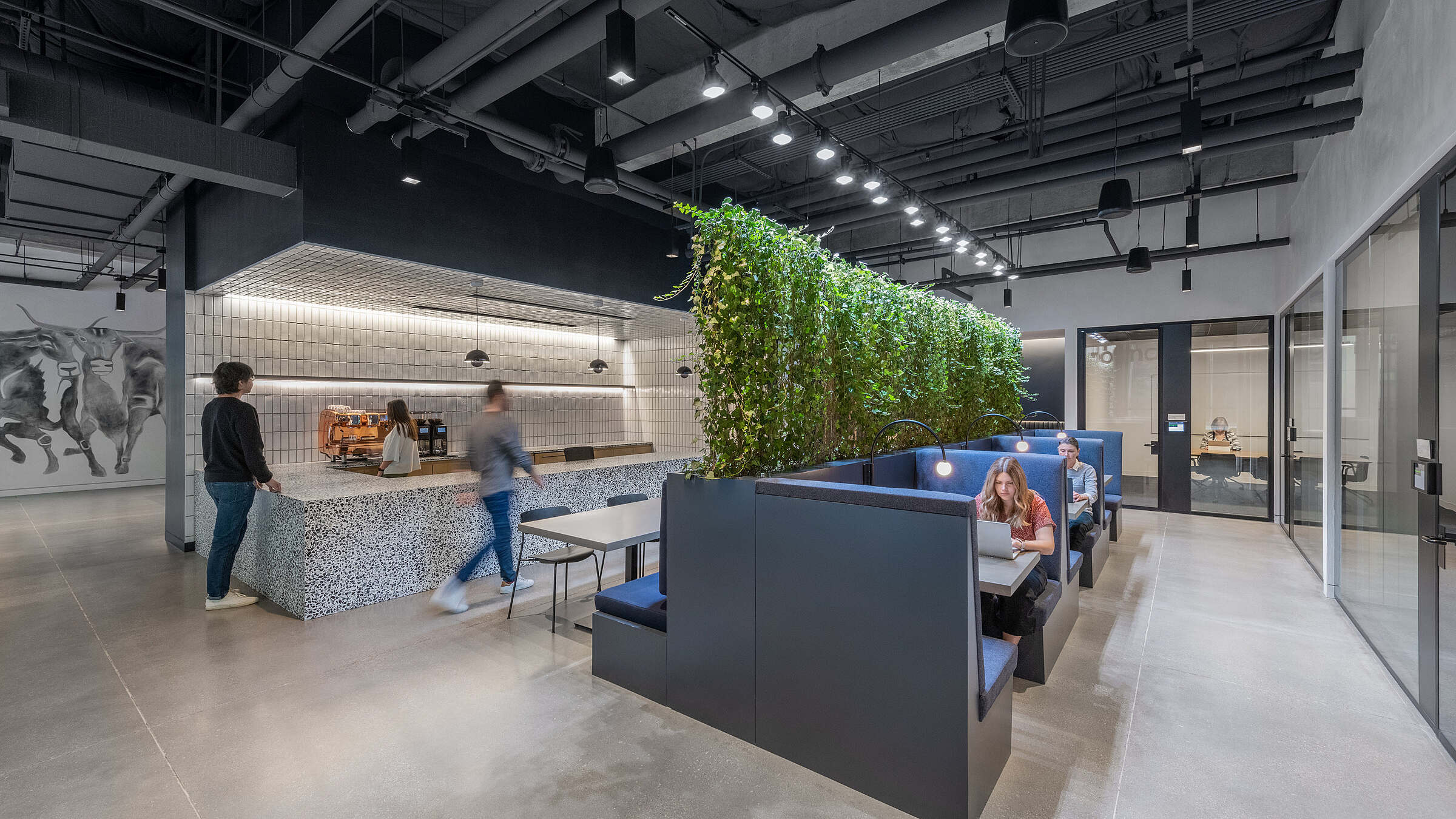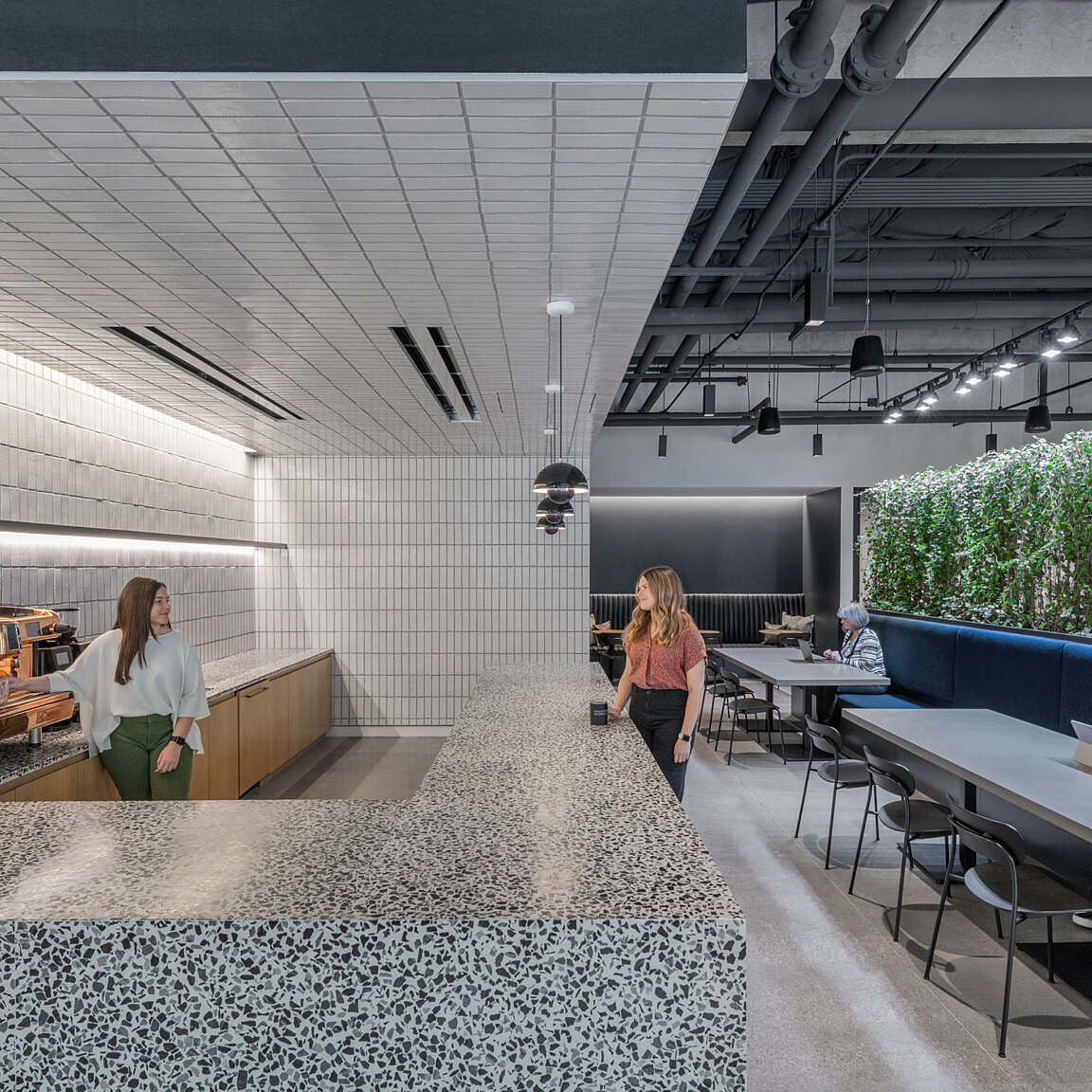 Design challenges included multiple entries at different levels within the suite that required coordinated access. In addition, because the space had been vacant for more than a year as a shell space, code required the design to provide the correct floor separation with the parking garage above the space. Because the Owner is a national firm with design standards, materials for this site were in multiple countries, creating a challenge when coordinating and receiving materials in a timely manner.