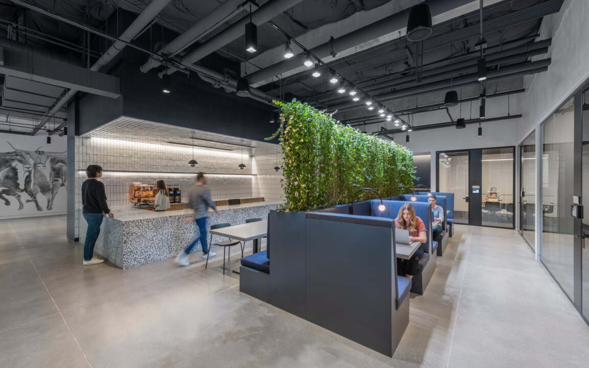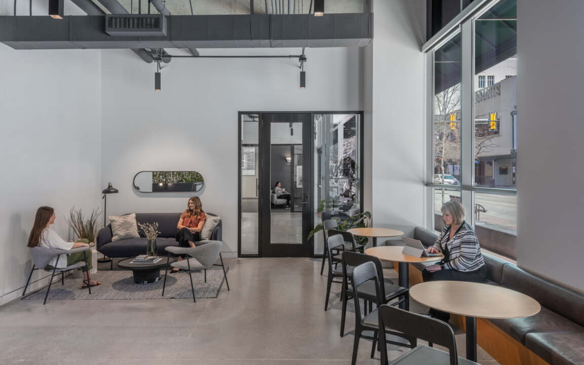 Providing a space for human connection, comfort and productivity, this flexible office space sits in downtown Fort Worth. A local franchise, the décor theme plays on “Cowboys and Culture” with a mix of modern and historic while adhering to a national brand. Amenities include dual-panel modular offices, an in-house café, conference/break rooms, sound insulated phone booths and a kitchen/bar area; all designed to create an open, familial, connected, flexible environment with ample natural light. Modern bold color blended with raw and textured materials provide invigorating zones within the space for a variety of activities.