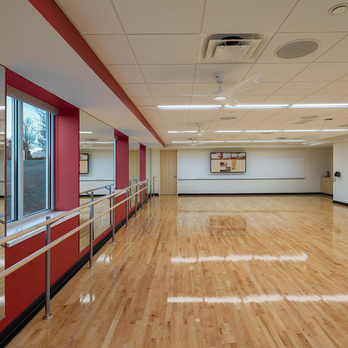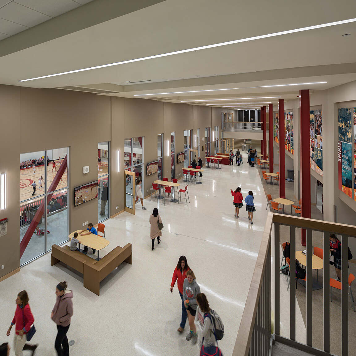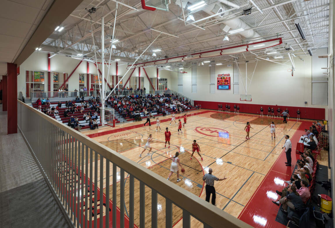 The main level contains the two-story Student Commons serving both the gymnasium and existing dining hall. Floor-to-ceiling glass showcases activity in the gymnasium, and concessions serves event spectators. Also included on this level are a divisible multipurpose room, office suite and storage. Corridors at the upper level overlook the gymnasium below and lead to four new innovative classrooms.