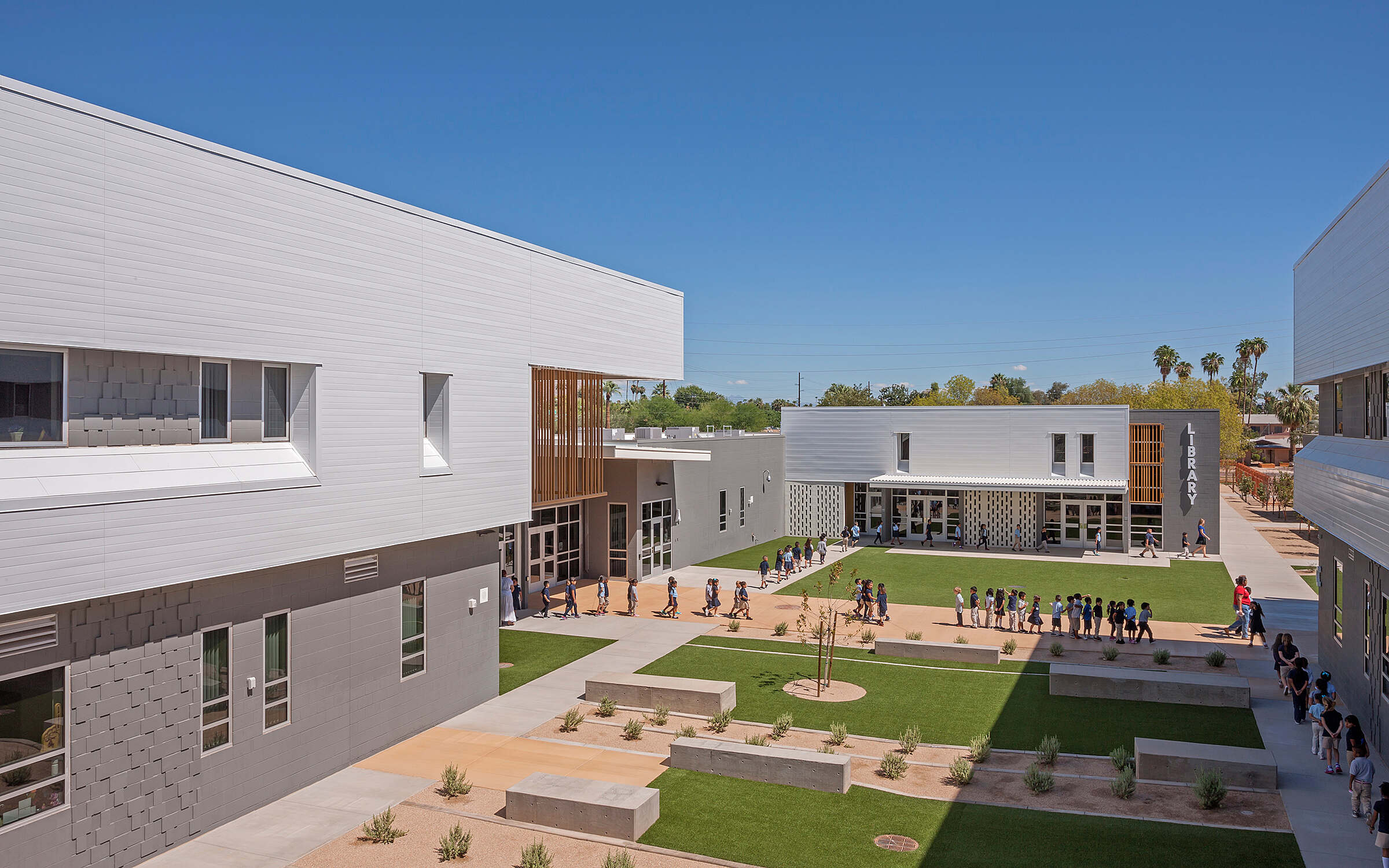 Creighton Monte Vista Elementary School is a modern K–8 campus that thoughtfully blends mid-century modern design with the cultural and architectural heritage of its downtown Phoenix neighborhood. Drawing inspiration from the area's historic orchard groves and iconic orange trees, the school celebrates its unique roots while offering a contemporary, forward-thinking environment for learning. Every element of the design reflects a respect for place and community, resulting in a campus that feels both grounded in tradition and alive with new possibility.