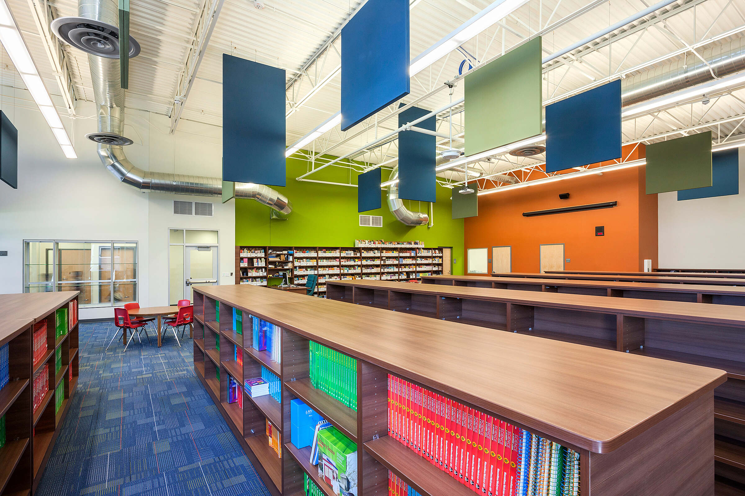 Colorful and welcoming, the library’s vibrant design encourages students to explore, read, and engage with their environment. Flexible shelving and natural light create a dynamic space that supports both quiet reading and interactive learning experiences.